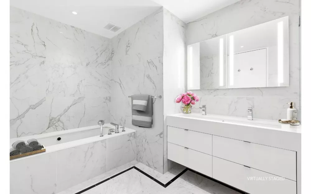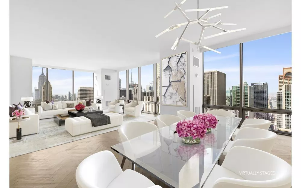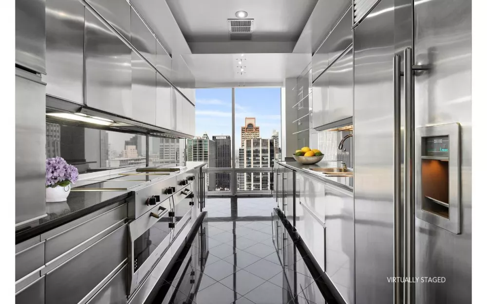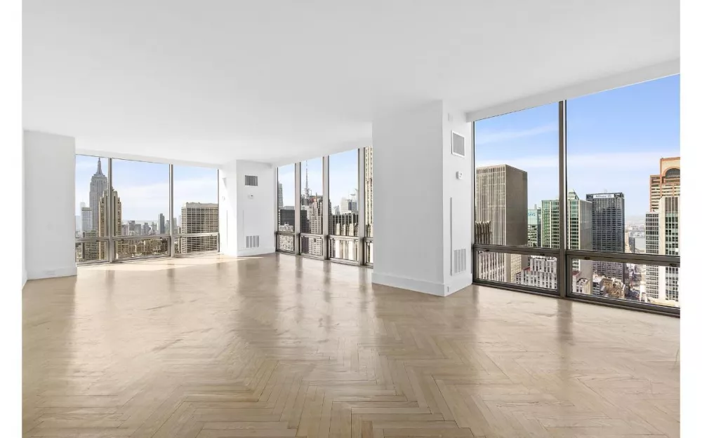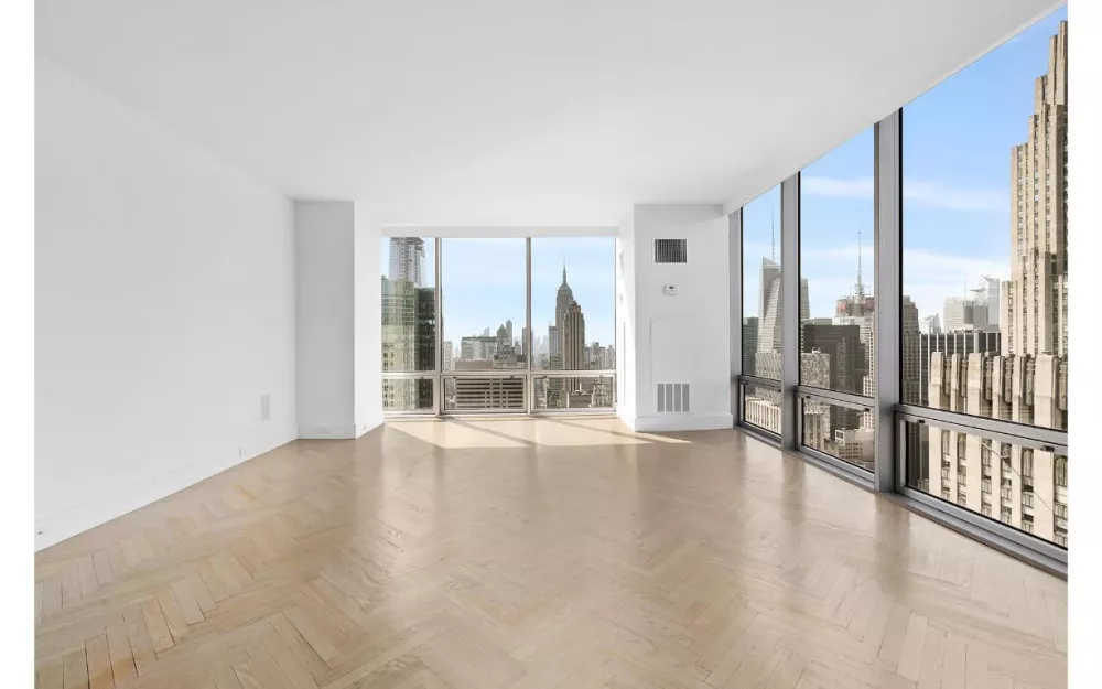 Colossal 1,800 square foot, corner 2 bedroom, 2 bath renovated home with dining area towers on the 45th floor , flooded with sunshine and gorgeous unobstructed views through 9 foot floor to ceiling windows. The wood floors are pickled oak , motorized shades , and surround sound with in -wall speakers. Stunning downtown southern views over St. Patrick's Cathedral highlight The Empire State Building and The Freedom Tower. The dazzling skyline views west on Fifth Avenue shines with Rockefeller Center and snapshot Central Park vistas . Stunning by day and a glamorous knockout at night with mesmerizing views! Entry foyer welcomes you to a dramatic open plan impressive living room with spacious dining area . The windowed renovated eat in kitchen was designed with the gourmand in mind . Stainless steel kitchen with Gaggenau double cook top grill and range and double ovens, 42" Subzero, custom cabinetry and pantry and Miele washer /dryer in utility custom closet. Private master bedroom wing with two mammoth master sized bedrooms laden with custom closets. There are two brand new bathrooms with Carrera marble white wall tiles and Statuary White marble floor tiles, stone counters, polished chrome plumbing fixtures & accessories by Kohler. master bathroom features a separate shower and massage tub with double custom painted vanities and drawers.