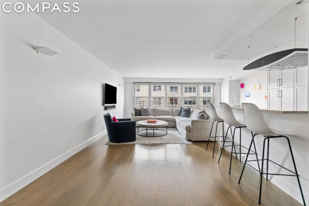 The welcoming entrance hall with two closets, including a walk-in, sets the tone for this exquisite residence that has been renovated from top to bottom. The open-concept layout seamlessly blends the living and dining areas, creating an ideal setting for both relaxation and entertaining. The 30+ foot sun flooded living room is incredibly spacious and has two options for dining. The dining alcove is currently being used as a home office with a sleekly designed custom built in desk but can be easily converted to a third bedroom. The gourmet kitchen is a culinary masterpiece, equipped with top-of-the-line appliances including a Miele range and hood, integrated Miele refrigerator/freezer, Miele dishwasher, gorgeous white custom cabinetry with a sizable pantry closet and quartz countertops. The kitchen is open to the living room featuring a large breakfast bar with counter seating, the perfect place to enjoy your morning coffee.