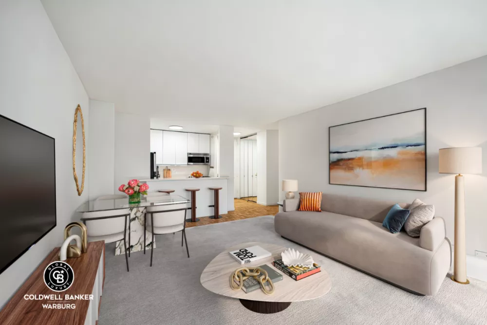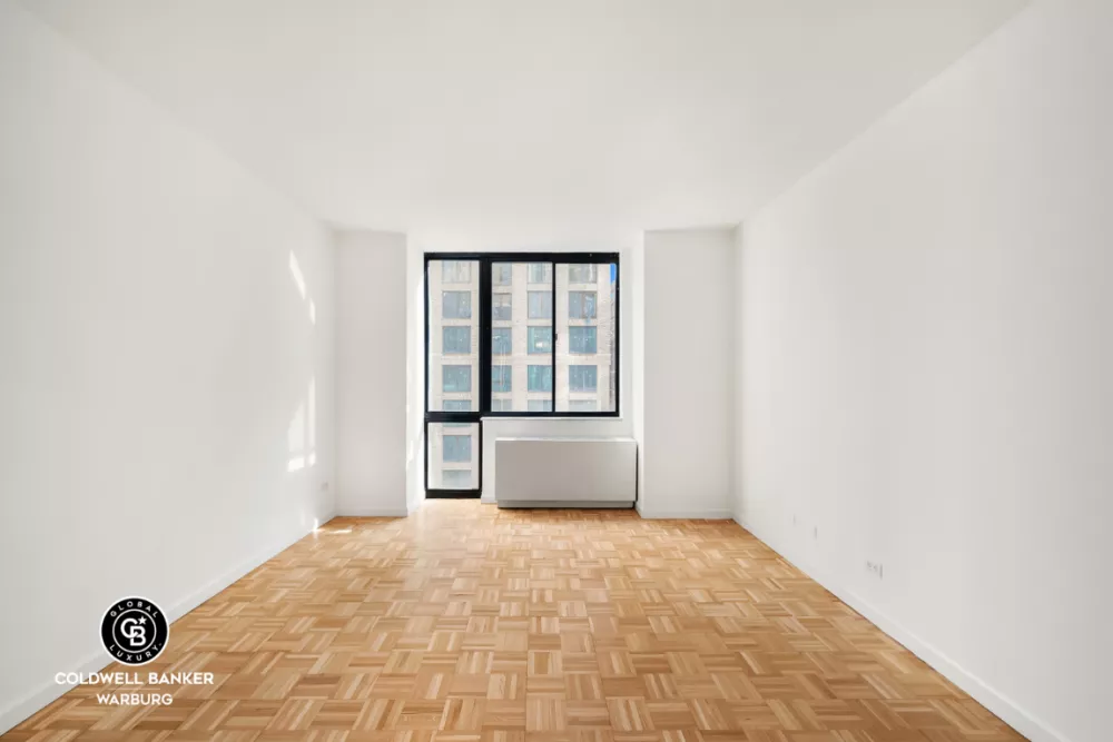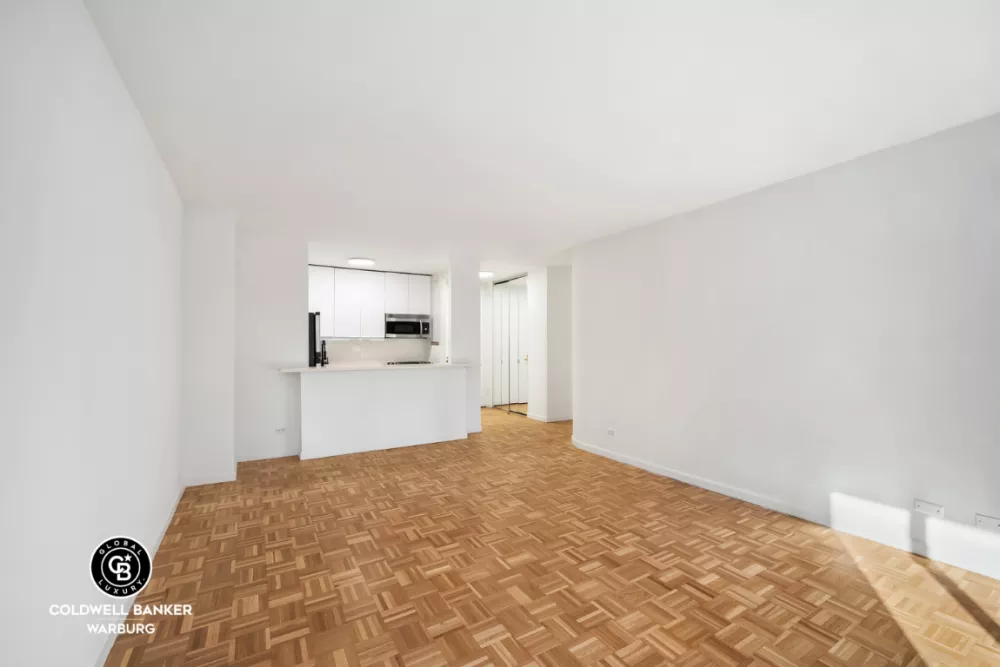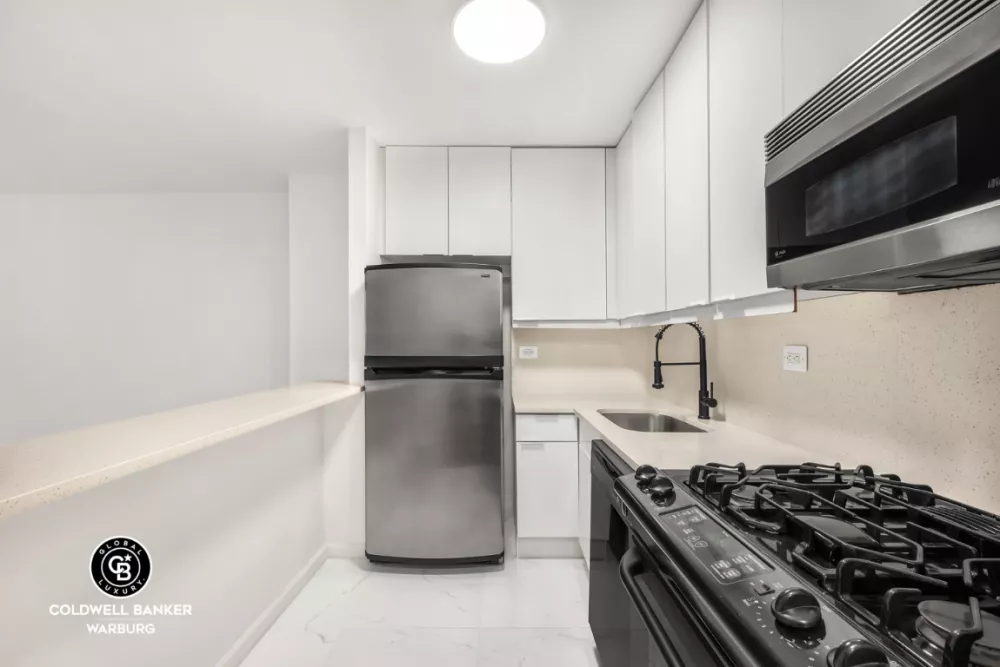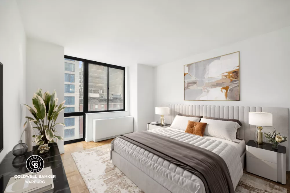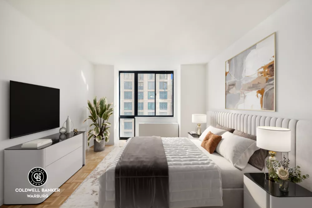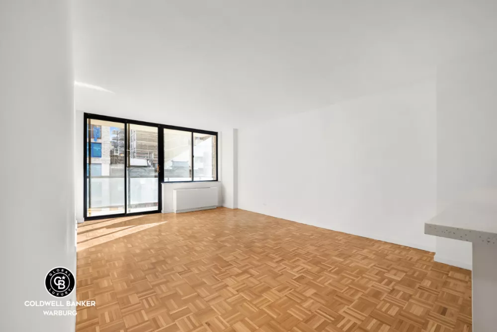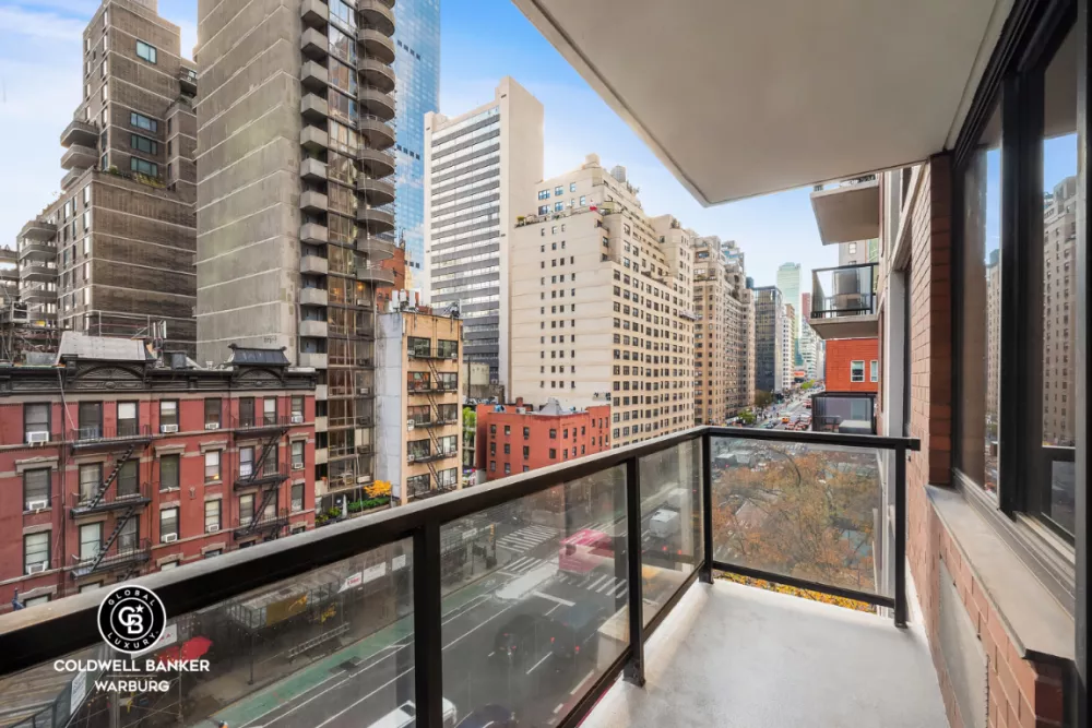 Spacious, modern, and chic one-bedroom apartment in Manhattan's Turtle Bay neighborhood. Enjoy sunrises from bed via the oversized windows in this updated apartment or by stepping out onto the balcony just off the living area. The recently updated, open kitchen has fresh countertops and an updated appliance package with plenty of room for two occupants to cook simultaneously. The combined living and dining area has enough space to hold a large couch with two side tables, a coffee table, a dining table to seat four comfortably, stools for the island, and a TV stand. The queen-sized bedroom comfortably holds side tables and lamps for additional lighting. His and her closets round out the primary retreat, making the space warm and inviting, as well as comfortable and functional. The updated bathroom across the hall has plenty of space and storage. The Sterling is a full-service condominium in vibrant Midtown East of Manhattan. The building provides 24-hour door attendant and concierge, live-in super, and laundry room, and is close to Grand Central Station and several other subways and bus stops. The Theater District is also nearby for your entertainment, along with countless options for shopping and dining, and the boardwalk of the East Midtown Greenway is close by for your morning run or evening stroll.