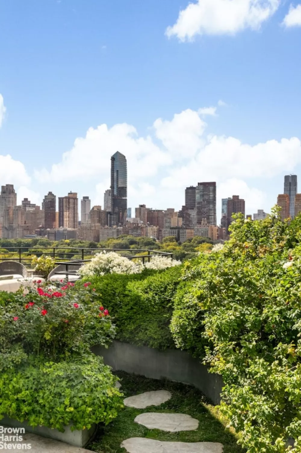 The main bedroom suite, located on the lower floor, offers stunning Central Park views and direct terrace access. Its spacious en-suite bathroom features heated marble floors, double sinks, a large soaking tub, and a shower, all finished in luxurious onyx. Additionally, there are two generously sized bedrooms on the first floor, each with en-suite bathrooms, ample closet space, large windows, and terrace access.