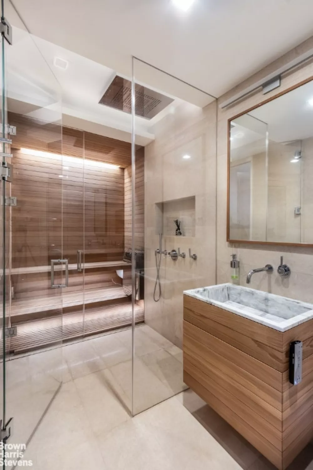 The upper floor houses three generous sized bedrooms and 4 baths which includes an oversized superb sauna. On this floor, all bathroom floors are heated and have Toto toilets and onyx finishes throughout. A comfortable sitting area has been created at the upper landing; there are also sufficient closets to make a closet lover's heart sing. This apartment must be seen, it is truly the epitome of sophistication and refinement.
