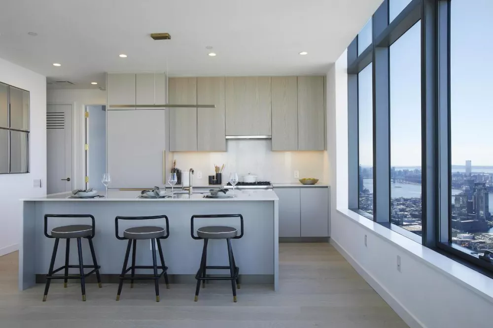 The enormous chef-inspired kitchen, with its abundant cabinet space, is ideal for everyday living or some culinary explorations. It is composed with cabinetry finished with sand ash veneer and extreme matte laminate, a Viatra quartz slab countertop and backsplash, top-of-the-line Bosch appliance package that includes an outside venting range hood, and Monogram microwave.