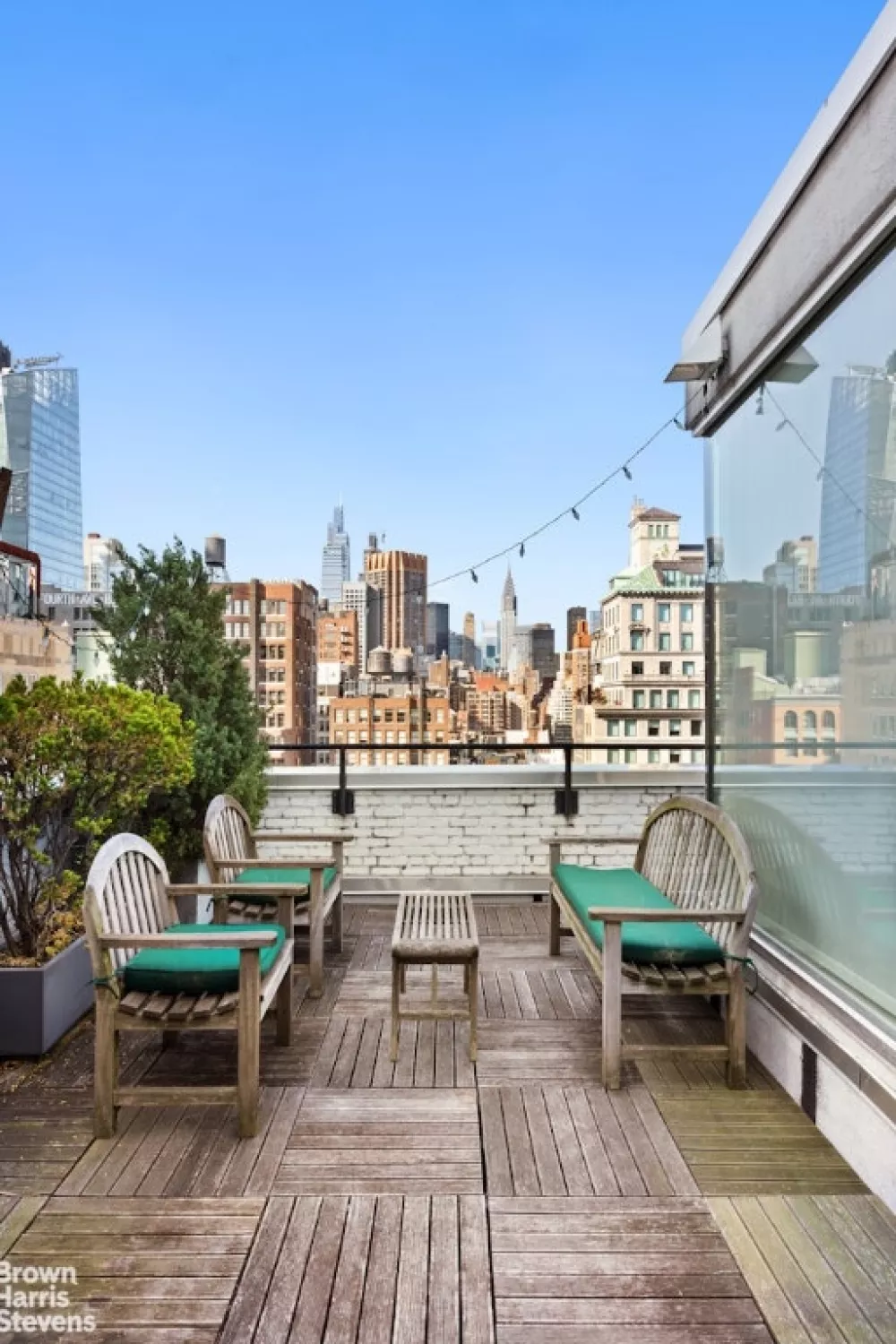 Step off the key-locked elevator to a private landing where separate entrances lead to both the residence and the private studio. Upon entering the residence, a foyer leads to a breathtaking 40-foot wide Living/Dining room bathed in natural light with 11-foot beamed ceilings, gorgeous slate floors, a working fireplace and unobstructed views of midtown Manhattan from a wall of double glazed windows. Just beyond, you'll find the large windowed chef's kitchen with abundant cabinetry and professional stainless steel appliances. Nearby, a comfortable den easily converts to a bedroom, while a separate hallway leads to two bright bedrooms and two full bathrooms. Off the living room, a wide curved staircase leads up to the sun-blasted penthouse level currently used as a primary bedroom suite replete with a full bathroom and access to a large private roof terrace with multiple seating areas and sweeping views of the Chrysler Building and the city beyond. Completely separate from the residence, dual entrances lead a large dramatic sky-lit studio with two bright exposures and access to a separate kitchen. This wonderful space is completely independent or can be joined with the main residence to create a magnificent six bedroom home. The options are endless! Additional amenities include multi-zoned central air-conditioning, a vented washer-dryer, tons of storage space and custom lighting on dimmers throughout.