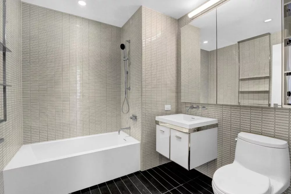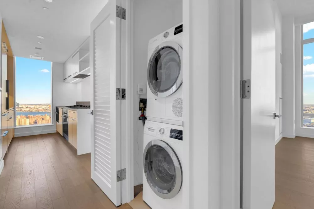 Residence 54D is a 1,164 square foot two bedroom, two bathroom with an open gourmet kitchen and breakfast bar. This spacious corner residence faces South East and North East with views of the city’s skyline, Empire State, East River, and Manhattan Bridge. Warm, modern interiors are brought to life by the renowned design team at Meyer Davis Studio. This residence features imported stone and custom finishes, premium Miele appliance package, 5" wide stained oak flooring, master bath with custom wood cabinetry, marble tile walls and mosaic floors with radiant heat, under-mount Wetstyle sink with glass vanity top and Dornbracht polished chrome faucets and a washer and dryer.
