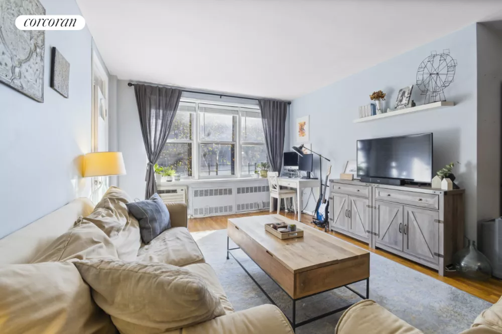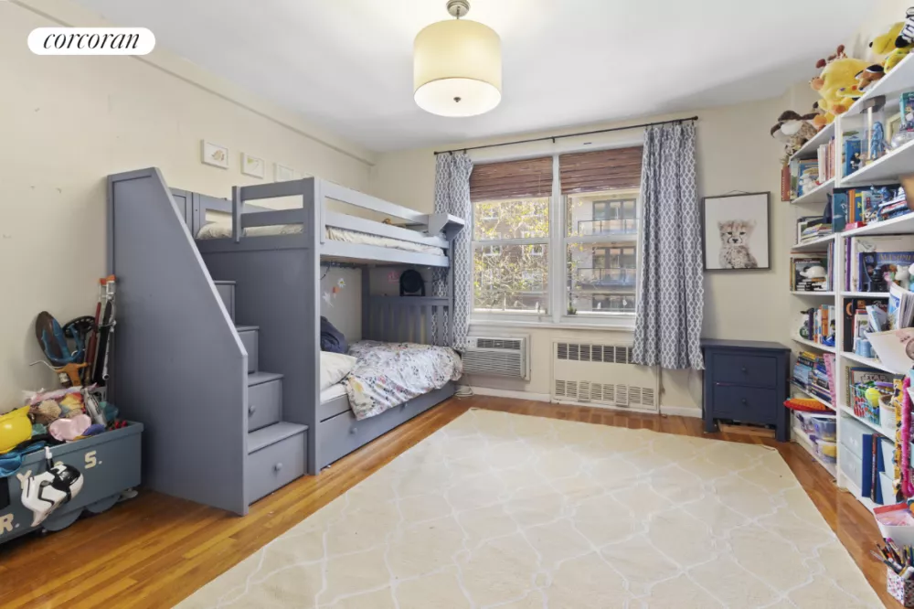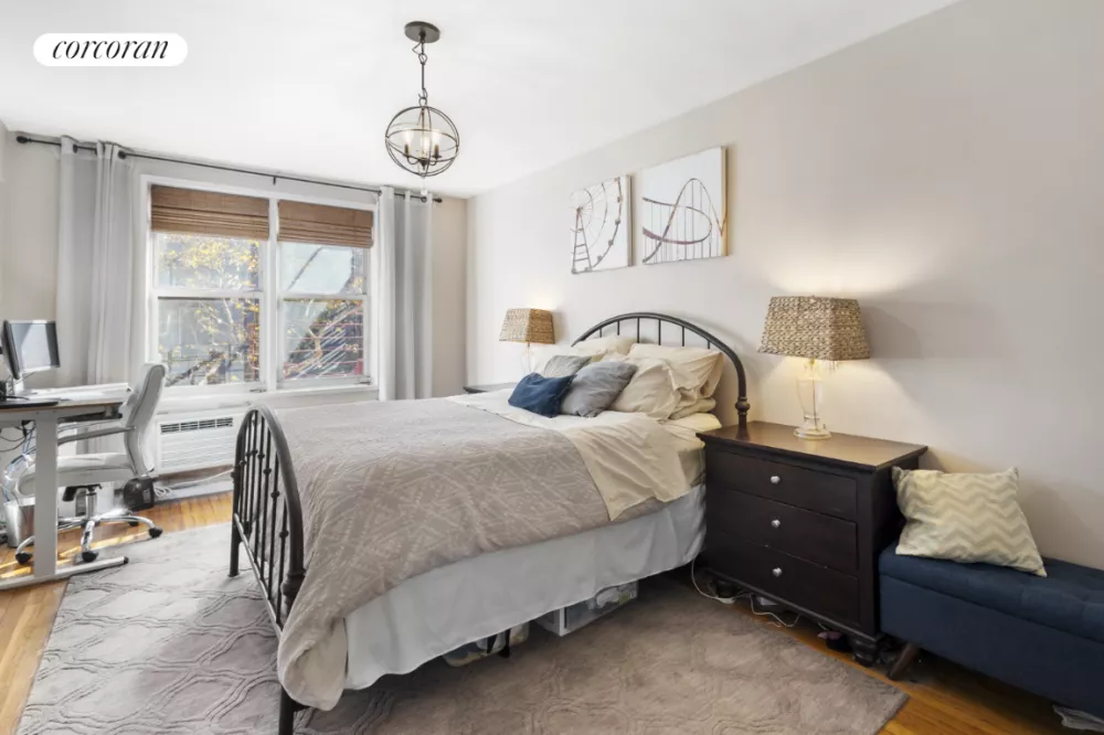 On the left of the living room is the private & covered balcony that has southeast views, which goes perfect with drinking a cup of coffee while overlooking the beautiful tree-lined block. The large master bedroom can easily fit a king size bed + additional furniture, and has a large walk-in closet to help you stay organized. The master bedroom has an en suite bathroom. On the opposite side is another large bedroom, with an enormous closet for additional storage. The second bathroom is located in the hallway adjacent to the second bedroom. The windowed kitchen has enough counter room for all your cooking needs and is fully equipped featuring a dishwasher, gas stove, and a refrigerator, as well as room to fit a dining table.