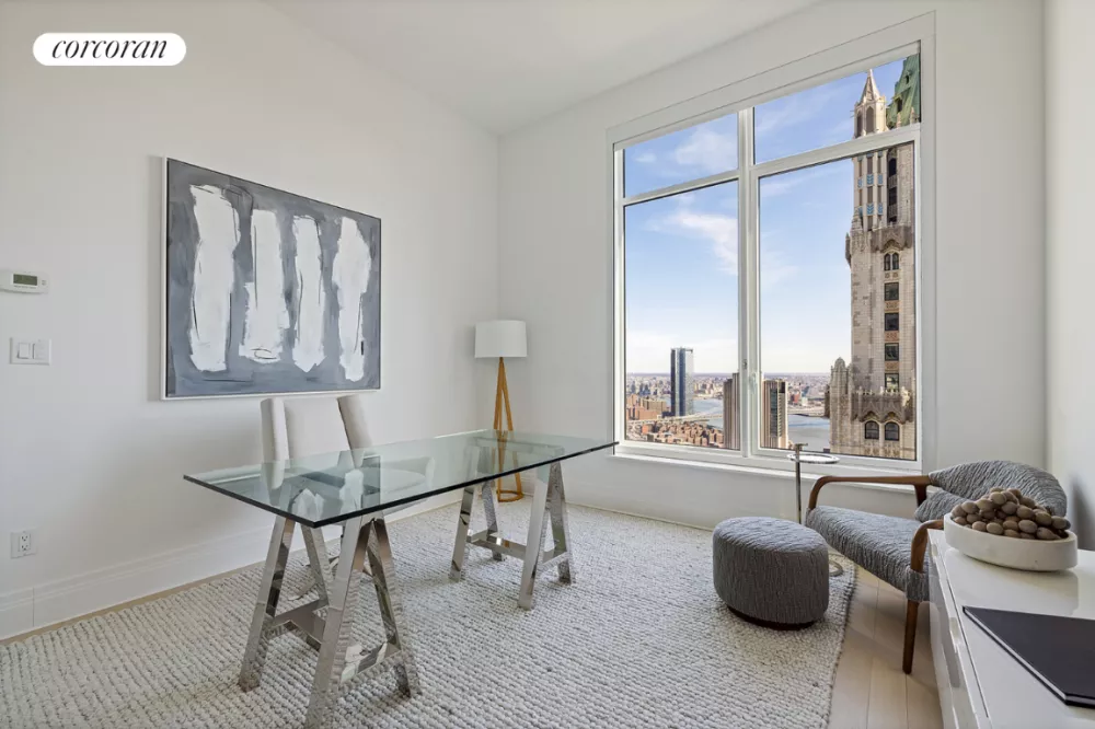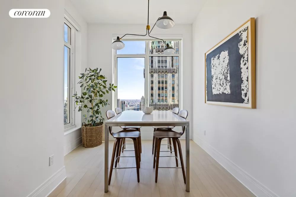 Welcome to the Four Seasons Private Residences! This home sits on the northeast corner enjoying sweeping views of the Midtown skyline and East River. A windowed Eat-In Kitchen complements the Living/Dining Room. The Primary Bedroom Suite features 2 exposures, generous closet space, and a 5-fixture bathroom. Welcome to 5-star living at 30 Park Place, Four Seasons Private Residences New York, Downtown. Developed by visionary Silverstein Properties, Inc., masterfully designed by Robert A.M. Stern Architects, and serviced by legendary Four Seasons Hotels and Resorts. With residences beginning on the 39th floor, the sweeping views are unparalleled. Residents may enjoy access to Four Seasons Hotel amenities including a spa and salon facilities, 75' swimming pool, attended parking garage, restaurant, bar and lounge, ballroom facilities, and meeting rooms, as well as a comprehensive suite of a la carte services. The 38th floor is devoted to private residential amenities including a fitness center and yoga studio, private dining room, conservatory and lounge with access to loggias, Roto-designed playroom, and screening room. Interior finishes include solid oak wood flooring with herringbone pattern in the formal rooms, Bilotta rift-cut oak kitchen cabinetry, Gaggenau appliances, and marble bathrooms with Robert A.M. Stern custom-designed vanities.