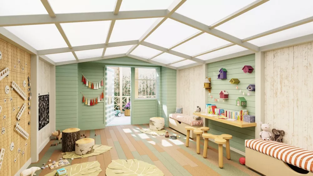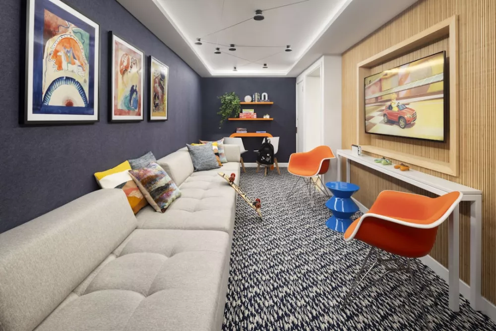 The indoor & outdoor amenity suite includes a Great Room that offers semi-private interconnected spaces; a Club Room for dining and intimate gatherings; a Fitness Room with state-of-the-art equipment and private movement studio; a Cottage Playroom-inspired by an enchanted forest-with a dedicated porch and secret garden away from the city bustle; a lounge with gaming station; private nooks; and private courtyard with landscaped outdoor space.