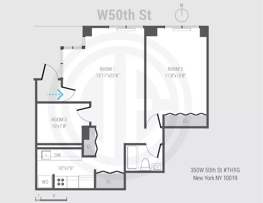 Direct and Private Access from the street and your own address: 360 West 50th Street as you enter. TH1G is a privately entered maisonette that is ideally situated next to the lobby of the famed Worldwide Plaza at 350 West 50th Street. It is one of a select collection of townhomes that are sequestered within the condominium complex and, in addition, happens to be the largest of the units, measuring almost 900 square feet. Such a property rarely becomes available and has the added bonus of having been legally zoned as a residential live-work space that allows the option of a professional office to operate or use it as live-work if you prefer.