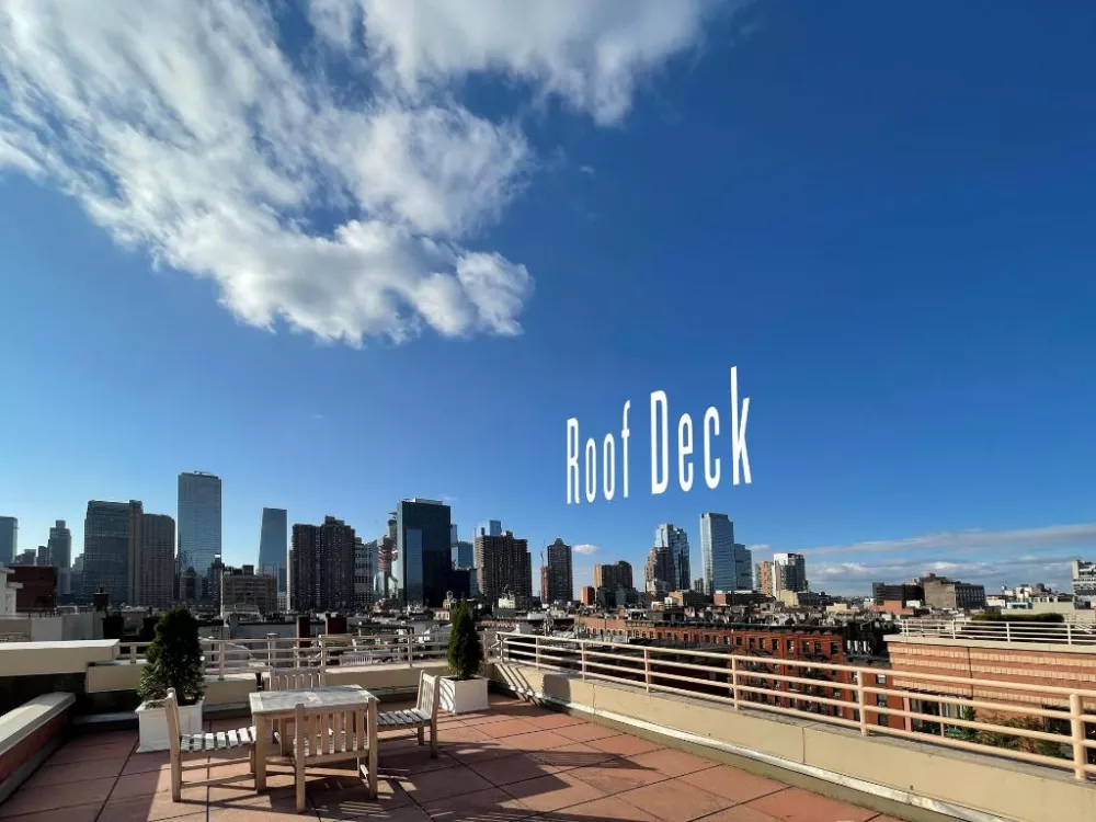 At this renowned New York City condominium, you will also enjoy panoramic Manhattan skyline views from the magnificent roof deck, a landscaped courtyard, and a lush, beautiful garden, along with 24-hour doorman, concierge, cold storage, and the opportunity to join the health club next door that offers a swimming pool and gym.