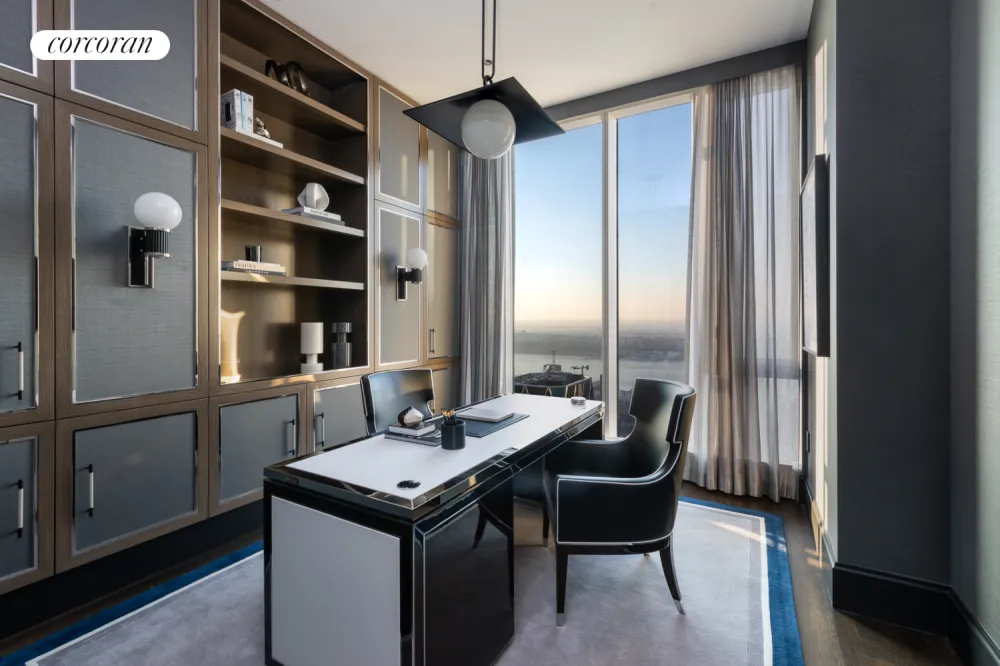 The intelligently designed floor plan includes three large en-suite bedrooms and a separate powder room. The corner primary bedroom suite boasts breathtaking south and west views and features an oversized walk-in closet and windowed five-fixture bathroom. Wake up each morning to the iconic landmarks of the famed New York City skyline and unwind in the evenings to beautiful sunsets over the Hudson River.