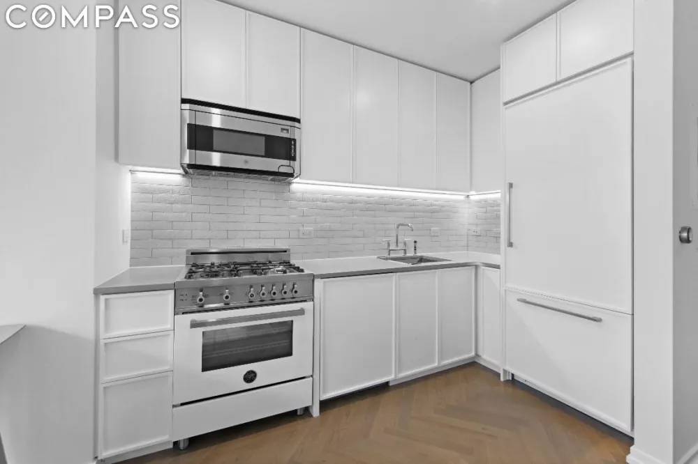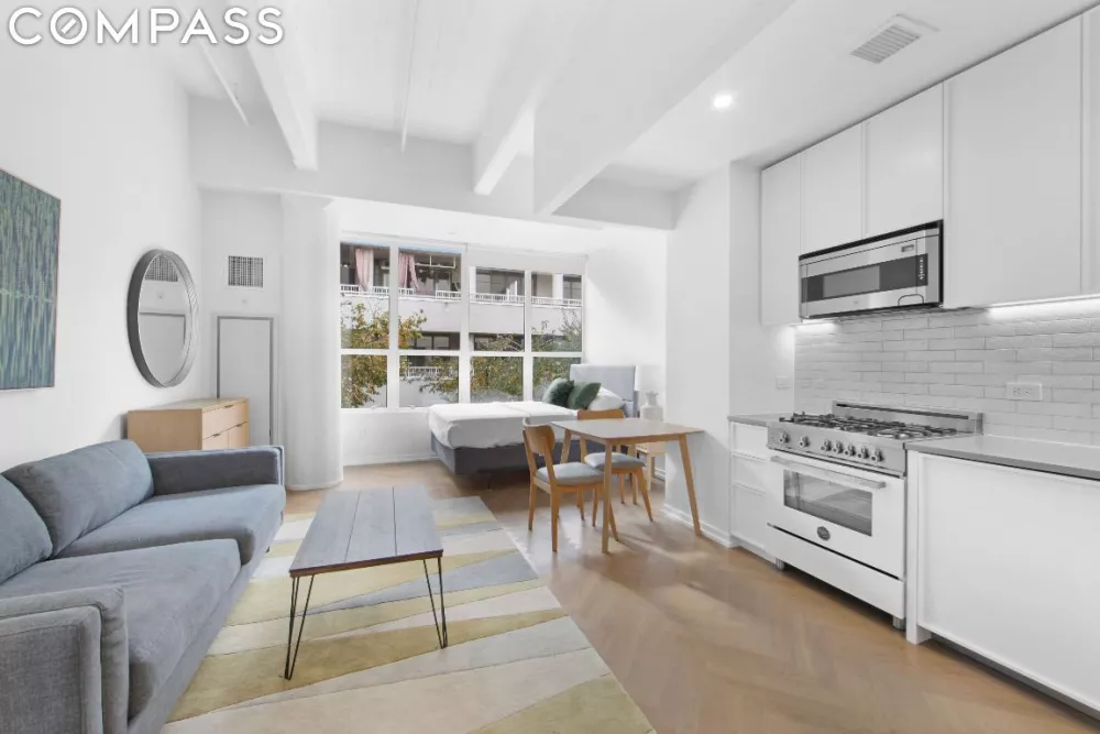 Sunny southern-facing studio at Austin Nichols House. The open L-shaped kitchen features a fully integrated Smart tech Dacor refrigerator, Bertazzoni four-burner gas stove, Sharp microwave oven, Asko dishwasher, and custom white cabinets. The bathroom features Pietre D’Italia mosaic floor tile, honed... See more