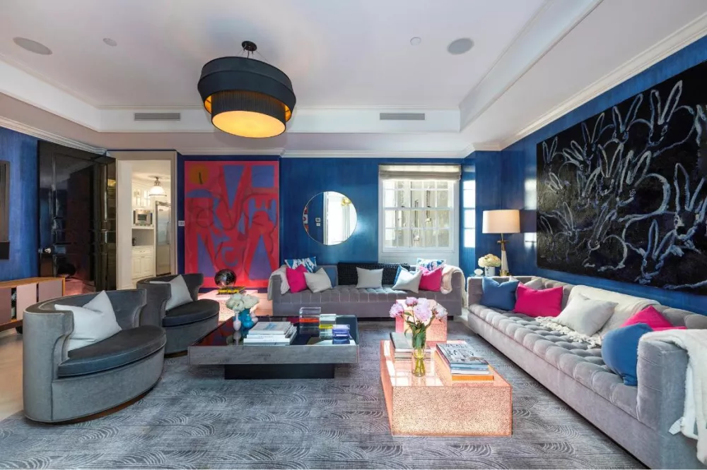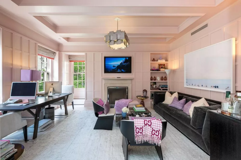 As you step off the private elevator landing, you are welcomed into a grand 32-foot-long living room with a fireplace, perfectly oriented to capture the vibrant energy of Park Avenue. This expansive space, designed for effortless conversation and entertaining, flows into a spacious den featuring an additional fireplace, creating a cozy retreat within the home.