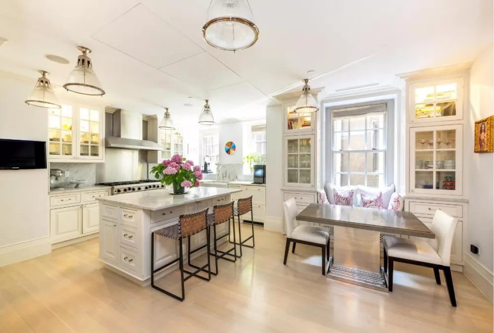 The large formal dining room provides an elegant setting for memorable gatherings, while the enormous chefs eat-in kitchen is a culinary dream. Adorned in pristine white marble, the kitchen boasts a center island and windowed banquet seating and a six burner Wolf Stove, offering both style and functionality. To complete the grandeur, the service elevator opens directly into the kitchen - ideal for all deliveries.