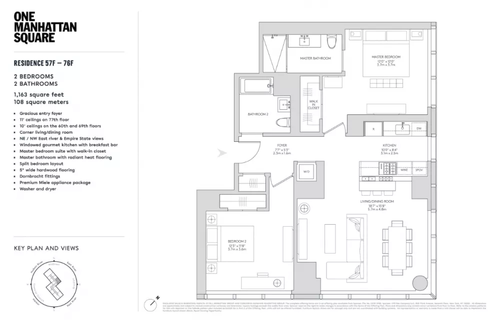 ONE MANHATTAN SQUARE OFFERS ONE OF THE LAST 20-YEAR TAX ABATEMENTS AVAILABLE IN NEW YORK CITY Residence 64F is a 1,163 square foot two bedroom, two bathroom with an open gourmet kitchen and breakfast bar. This spacious corner residence faces South West and South East, with spectacular sunrise and sunset... See more