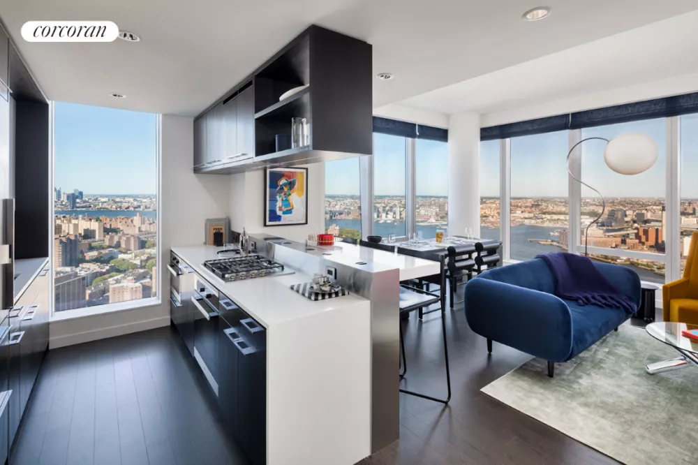 Residence 64F is a 1,163 square foot two bedroom, two bathroom with an open gourmet kitchen and breakfast bar. This spacious corner residence faces South West and South East, with spectacular sunrise and sunset views overlooking NY Harbor, Manhattan and Brooklyn Bridges and One World Trade. Warm, modern interiors are brought to life by the renowned design team at Meyer Davis Studio. This residence features imported stone and custom finishes, premium Miele appliance package, 5" wide stained oak flooring, master bath with custom wood cabinetry, marble tile walls and mosaic floors with radiant heat, under-mount Wetstyle sink with glass vanity top and Dornbracht polished chrome faucets and a washer and dryer.