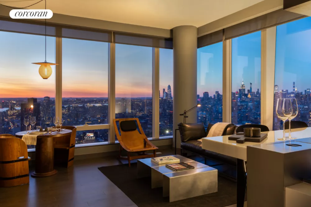 Residence 27L is a 1,123 square foot two bedroom, two bathroom with an open gourmet kitchen and breakfast bar. This spacious residence faces North East and North West, with expansive City and East River views. Warm, modern interiors are brought to life by the renowned design team at Meyer Davis Studio. This residence features imported stone and custom finishes, premium Miele appliance package, 5 wide stained oak flooring, master bath with custom wood cabinetry, marble tile walls and mosaic floors with radiant heat, under-mount Wetstyle sink with glass vanity top and Dornbracht polished chrome faucets and a washer and dryer.