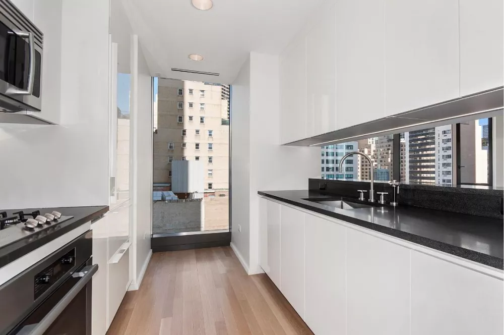 The kitchen is a windowed pass through featuring top of the line appliances from Sub Zero, Miele and Bosch. It includes white Poliform lacquered cabinets throughout, granite countertops, and ceramic tile backsplash. A Miele washer/dryer unit is available in the apartment.