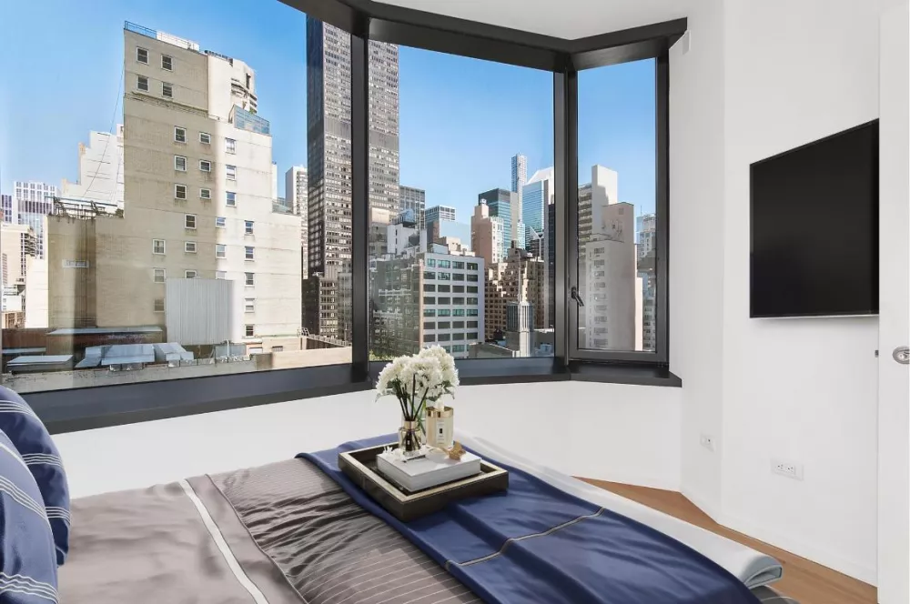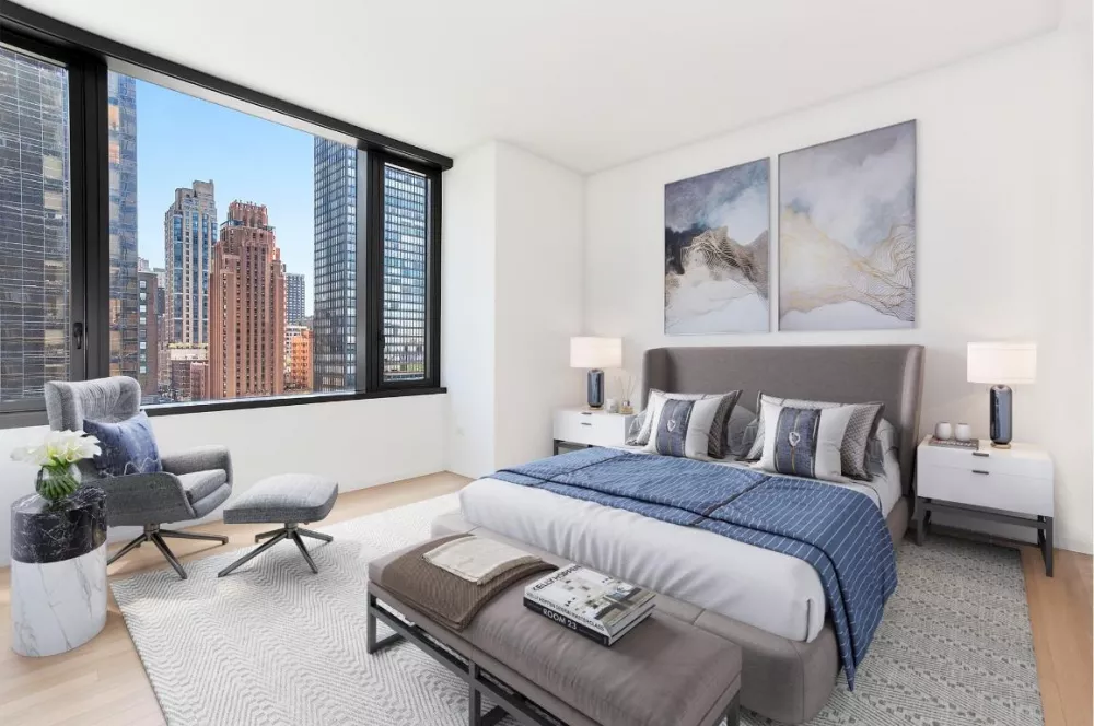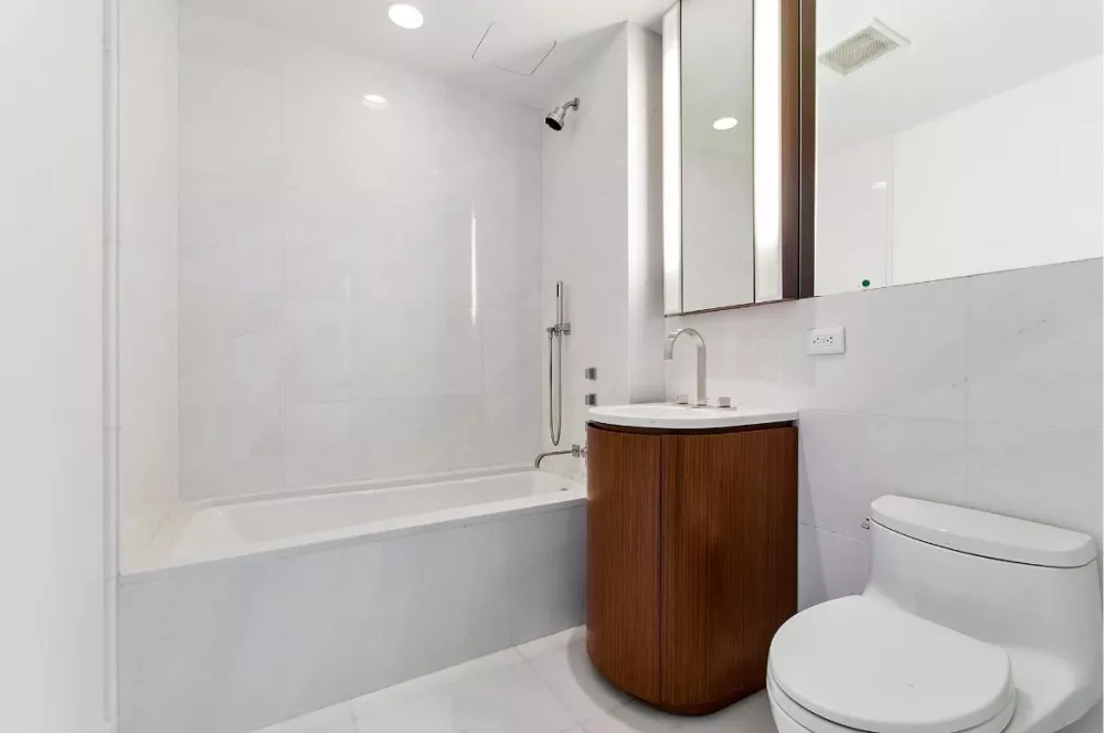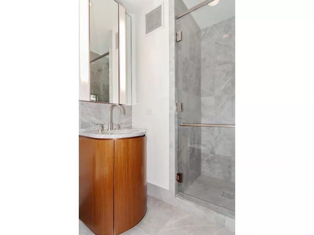 The generous master suite has a large north facing window with open views providing a glimpse of the United Nations sculpture garden and East River. There is an en-suite marble bathroom with radiant heat floors, a soaking tub, beautiful Poliform teak vanity and Dornbracht fittings.