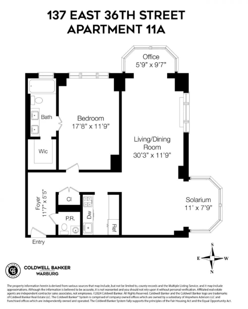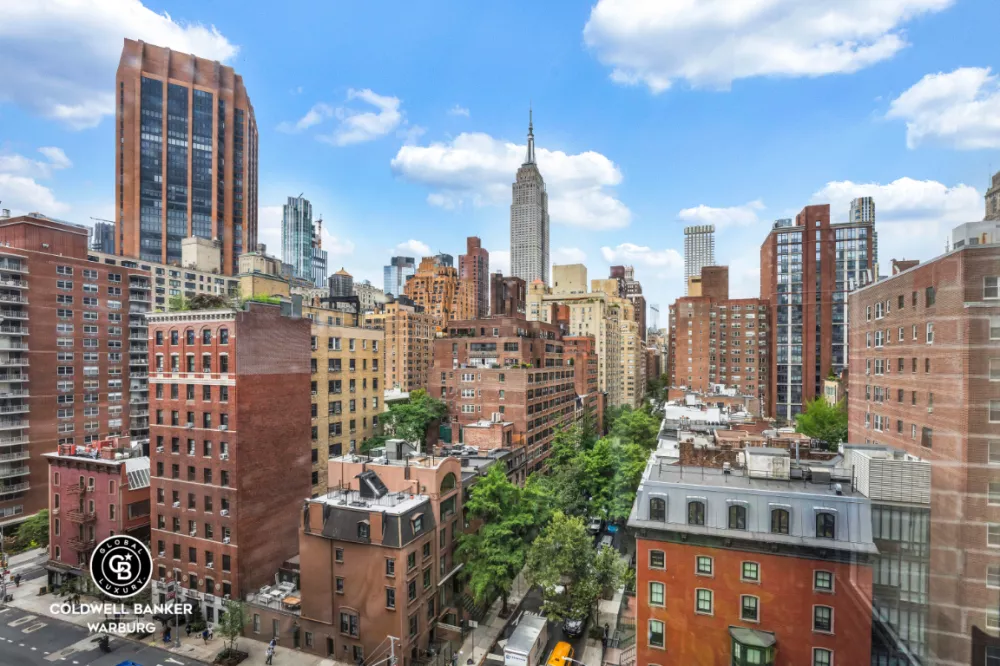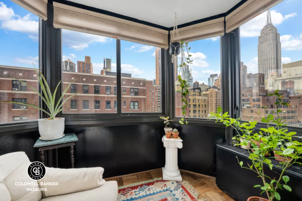 Welcome to apartment 11A, a rare opportunity to purchase a light flooded approximately 1100 square foot 1 bed / 1.5 bath home offering south and west exposures with fabulous direct Empire State Building views. There are two unique glass enclosed solariums off the living room that are drenched with sunlight and the floor plan can easily be converted to 2 bedrooms. The attractive kitchen has stainless appliances and a pass-through for easy to access when entertaining. The spacious master bedroom has a large walk-in closet as well as an en-suite windowed bath with a double sink vanity. A powder room is conveniently located off the foyer, there are hardwood floors, through-wall air conditioners, and lots of closet space compete this not to be missed home.