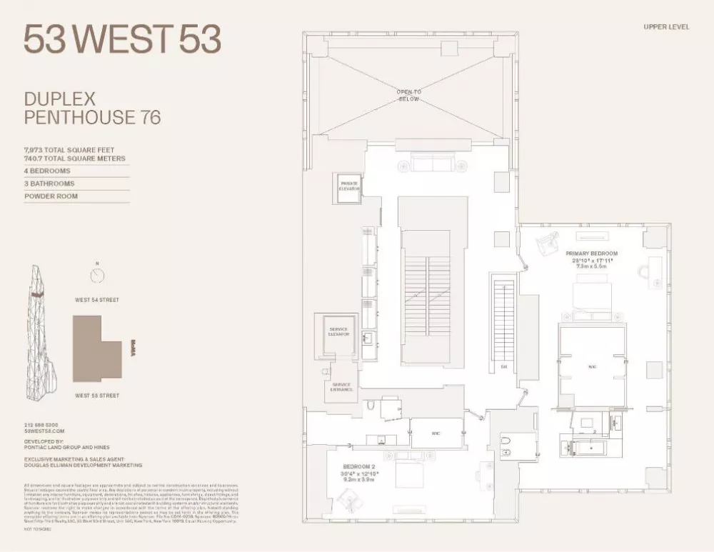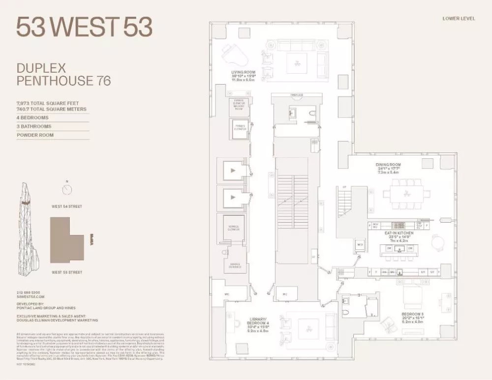 An oasis above the clouds, this one-of-a-kind duplex penthouse comprises the entire 76th and 77th floors at 53 West 53, spanning 7,973 square feet with 360-degree views from Central Park to New York's iconic cityscape skyline. The exquisite residence offers four bedrooms, three-and-a-half bathrooms, dedicated service entrance, private interior elevator, and north-, south-, east-, and west-facing exposures that span across Central Park, the Hudson River, East River, City skyline, and beyond. Gracious proportions, magnificent details, and ceilings that range up to approximately 21'8" set the awe-inspiring stage for world-renowned designer, Thierry Despont, to craft residences with many custom elements typically reserved for privately commissioned homes. These museum-quality finishes coalesce with expressive architecture by Pritzker Prize-winner Jean Nouvel to create singular spaces of unsurpassed grandeur and elegance in both scale and proportion.