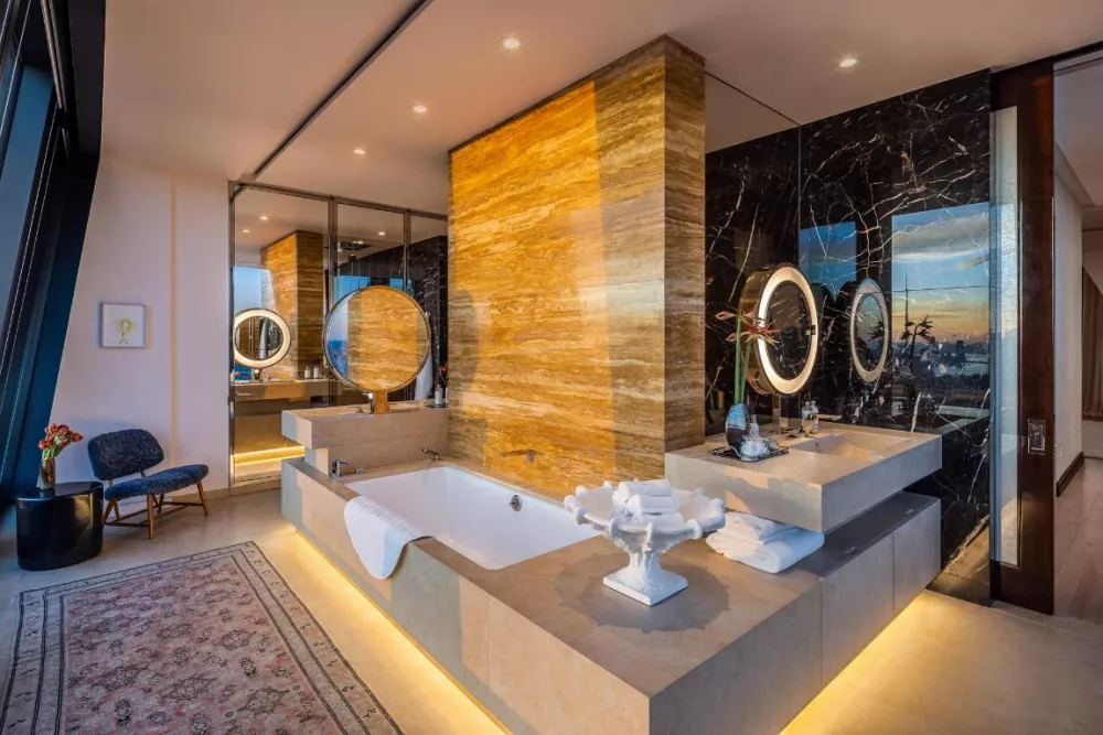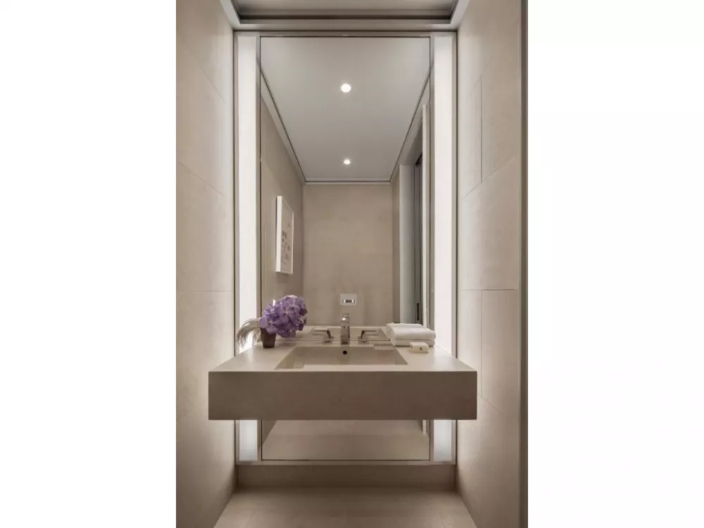 Accessible either via the dramatic interior staircase or the private interior elevator, the 77th floor is extraordinary. The primary suite offers panoramic views spanning north, south, and east, a large walk-in closet and spa-like ensuite bathroom that blends tradition and originality. Elegantly appointed in polished Noir St. Laurent marble, high-honed Verona limestone, and polished Persian golden travertine with polished nickel Dornbracht fixtures throughout, the primary bathroom features two separate custom carved vanities, a cast iron Lefroy Brooks soaking tub, freestanding steam shower, radiant heated floors, private water closet with commode and bidet, and a linen closet. An additional bedroom on this level offers south- and west-facing views and a windowed en-suite bath clad in high-honed Verona limestone with polished nickel Dornbracht fixtures. No detail has been overlooked, from the custom interior lighting design by Thierry Despont in collaboration with Schwinghammer, to the motorized Lutron solar shades throughout with additional blackout shades in each bedroom, to the supply of humidified and filtered fresh air throughout the home.