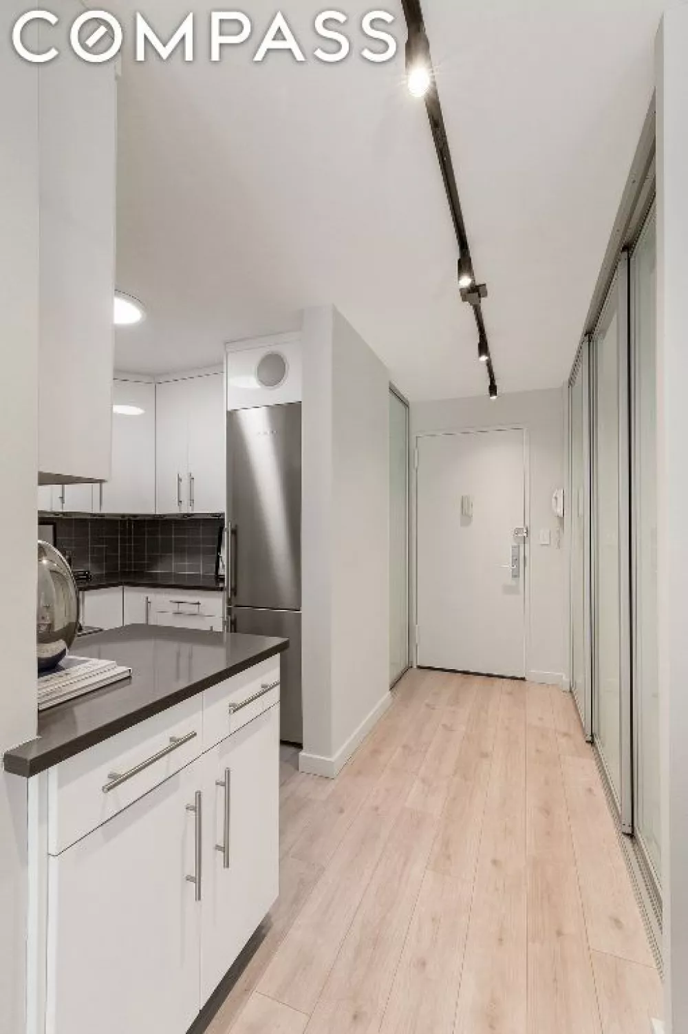 Storage is excellent throughout - There are over 12 feet of closets along the foyer as you enter, and 2 additional closets in the dining and bedroom areas, all outfitted with ELFA built-ins and attractive, premium floor-to-ceiling tinted glass sliding doors. Just past the hallway closets there is a lovely nook which works perfectly as a desk / work-from-home space.