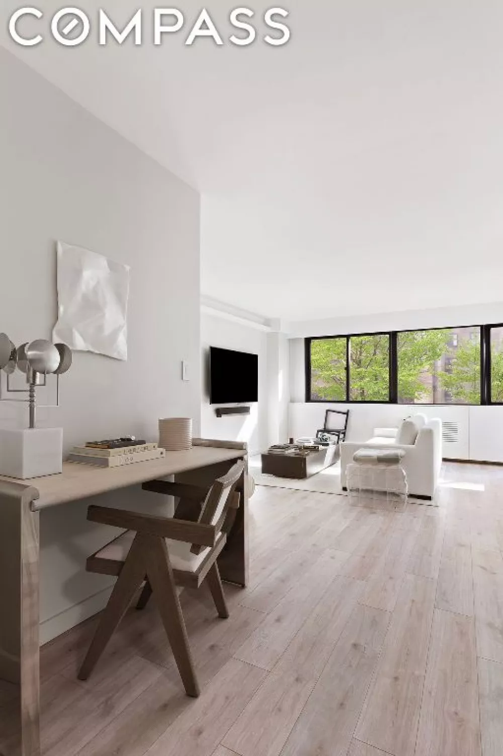 The main living space overlooks the building's landscaped courtyard garden and receives abundant southern light. There is plenty of room for a full living room set and dining table + chairs with seating for 4.