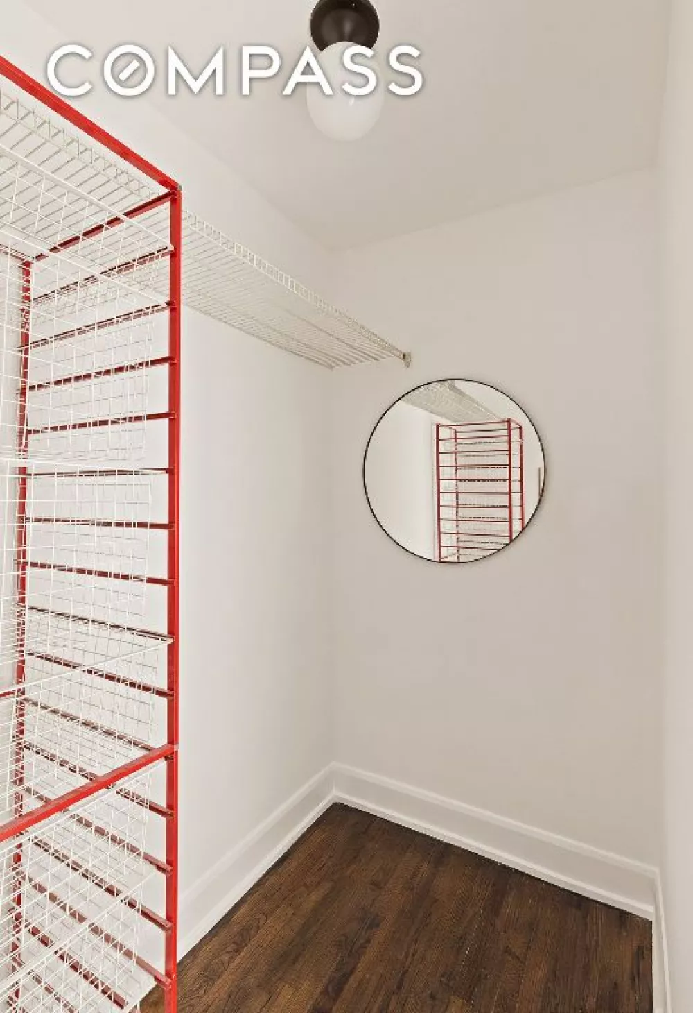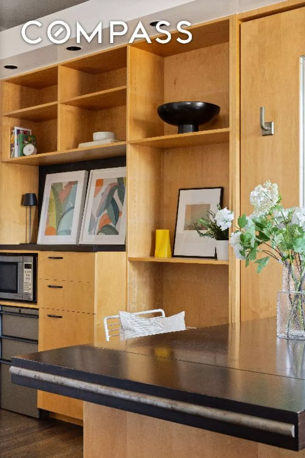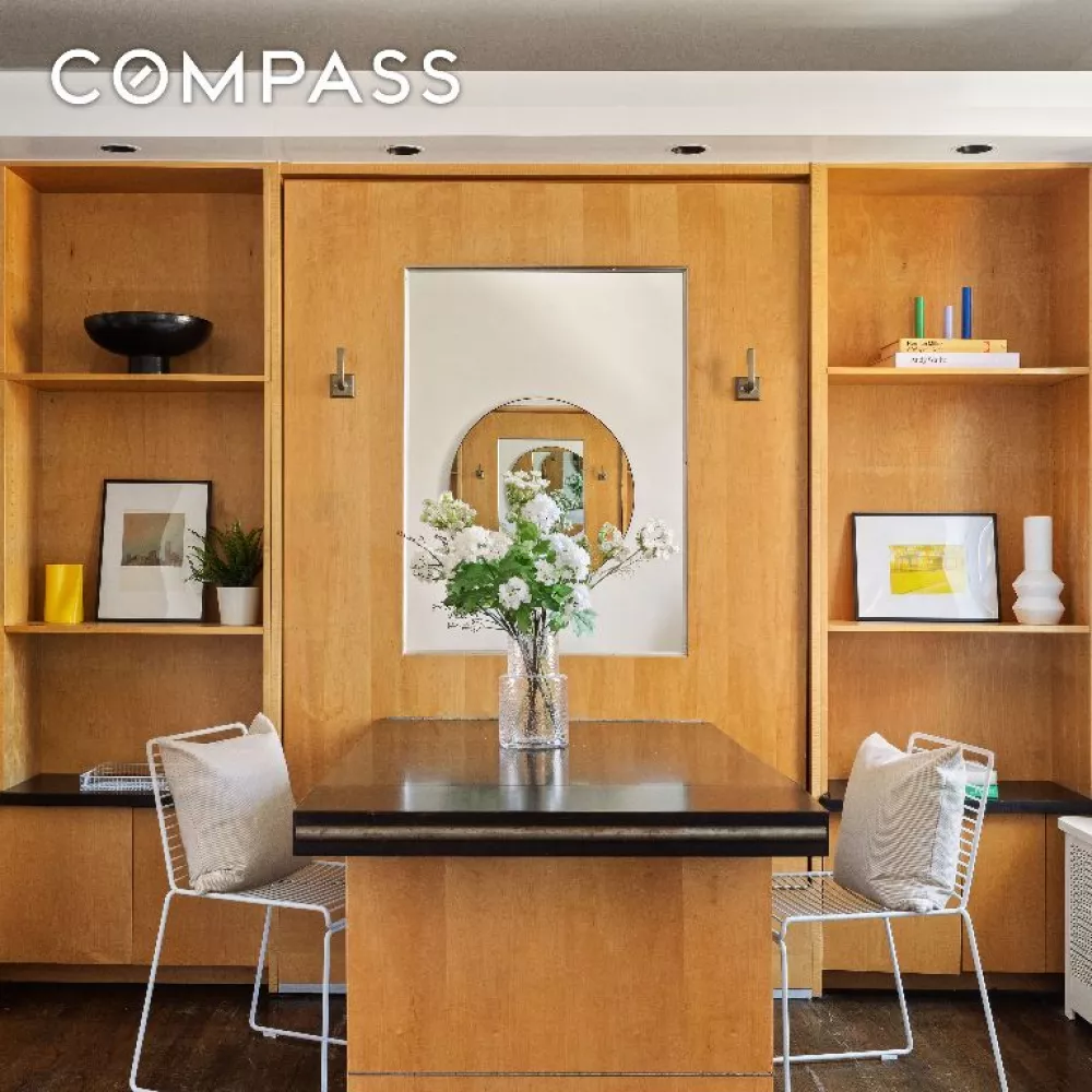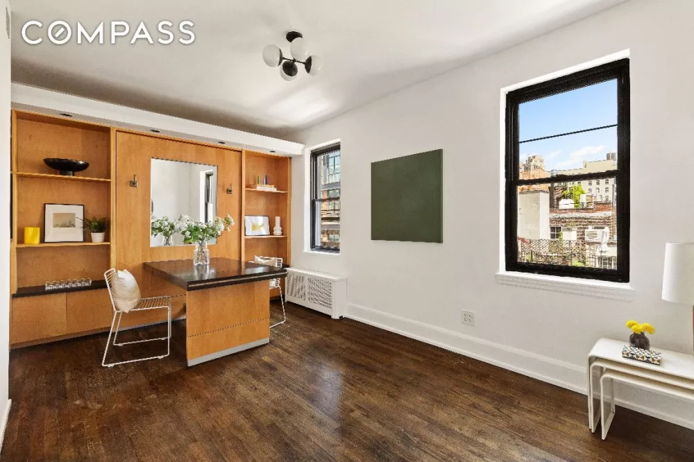 Unit 5E features a lovely entrance nook, hardwood floors throughout and two large windows facing out on to Greenwich St. The tiled bathroom has a thoughtful design, a large soaking tub and a fantastic skylight. A large walk in closet caters to all storage needs and an additional wall of custom bookshelves and cabinets conceal the units sleeping nook. When not in use, the customized wall of millwork converts to a sun drenched desk / dining table providing a delightful place to entertain or work from home. High ceilings, tons of charm and a great layout all offered on one of the best corners in the West Village!
