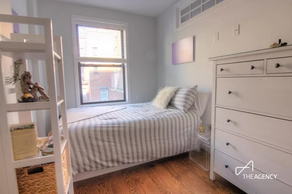 Unit 4 is configured as a 3 bedroom, 3 bath floor-through owner’s duplex apartment with a terrace. Among the special features of this apartment are over-sized windows, several skylights, ceilings as high as 10’ and an in-unit washer/dryer. The open kitchen includes island seating, stainless appliances and a full size dishwasher, while the generously sized living space has a separate windowed nook perfect for a home office or additional sitting area. The master suite has a spacious en-suite bathroom with a heated towel rack and benefits from a quiet location and good storage space. The second and third bedrooms are also pleasantly quiet with a private terrace off of the east bedroom.