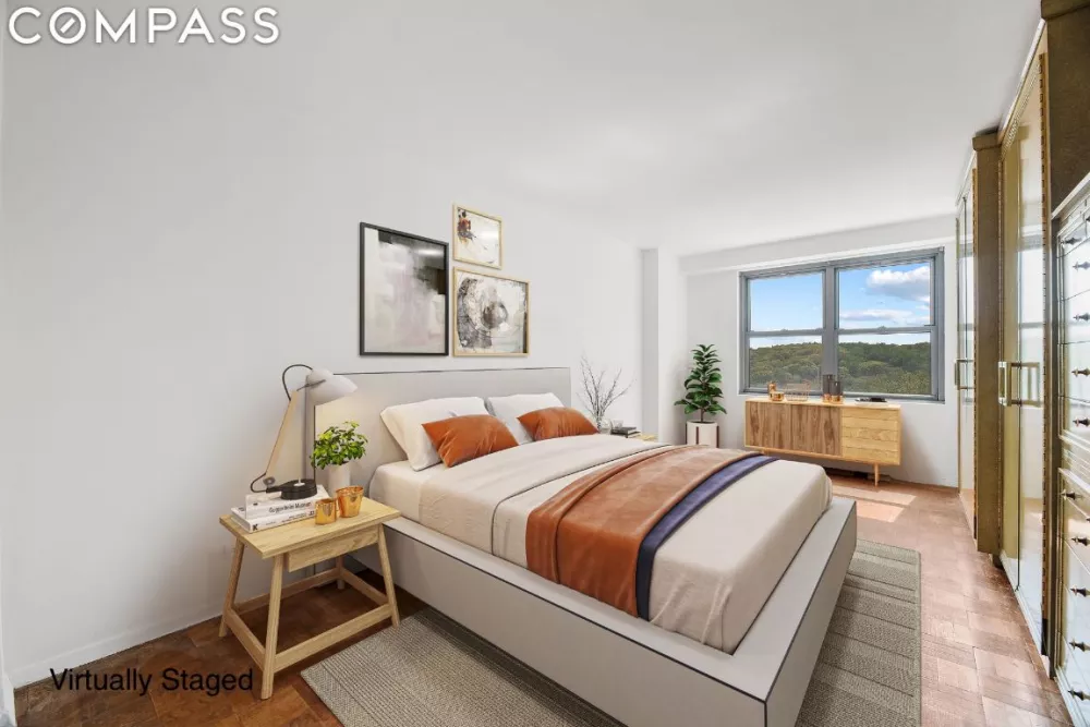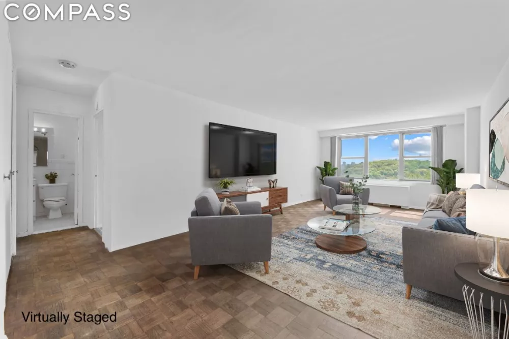 The apartment offers a large living space with bright windows overlooking Spuyten Duyvil Creek, Inwood Hill Park, and Manhattan beyond. Tons of closet space, parquet wood floors, and an updated bathroom.??