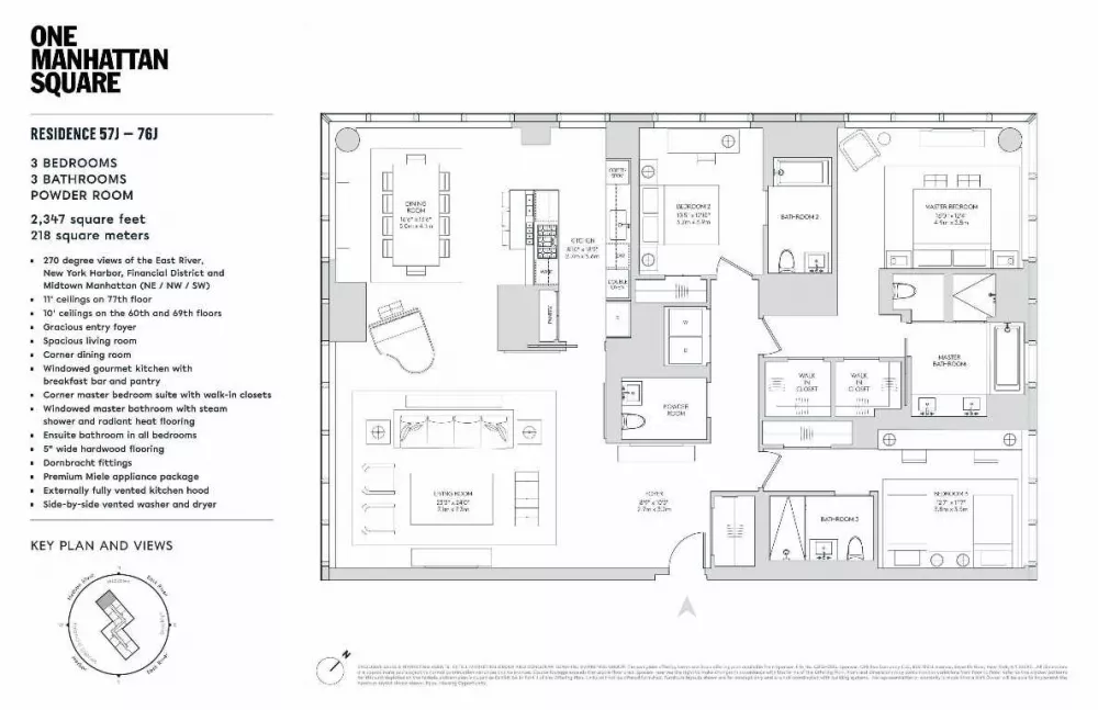 The Skyscape Collection, featuring Residence 77J, is a home in the sky. This generous 2,347 square foot triple exposure 3 bedroom, 3.5 bath residence is designed by Meyer Davis and features 270 degree views of the Lower East Waterfront, New York Harbor, Financial District and Midtown Manhattan. Astonishing panoramic views from South West and North West corner living room and dining room. Windowed gourmet kitchen with a breakfast bar, pantry closet, premium Miele and Subzero appliance package with a double oven plus speed oven, built-in whole-bean coffee system, integrated refrigerator, wine fridge, dishwasher and externally fully vented kitchen hood. Corner Master Bedroom suite with side-by-side walk-in closets, luxuriously appointed windowed 5 fixture ensuite bath with a steam shower, Wetstyle soaking bathtub with custom stone surround, radiant floor heating and a separate water closet. The second and third bedrooms are thoughtfully appointed with en-suite baths with imported stone and custom finishes. This residence comes equipped with a side-by-side, fully vented washer and dryer. A gorgeous powder room with a Boffi pedestal sink and Covelano marble polished stone accent wall and floors completes this magnificent home.