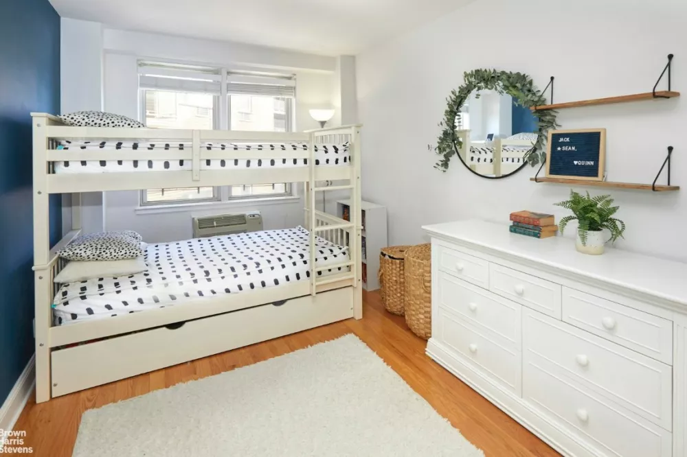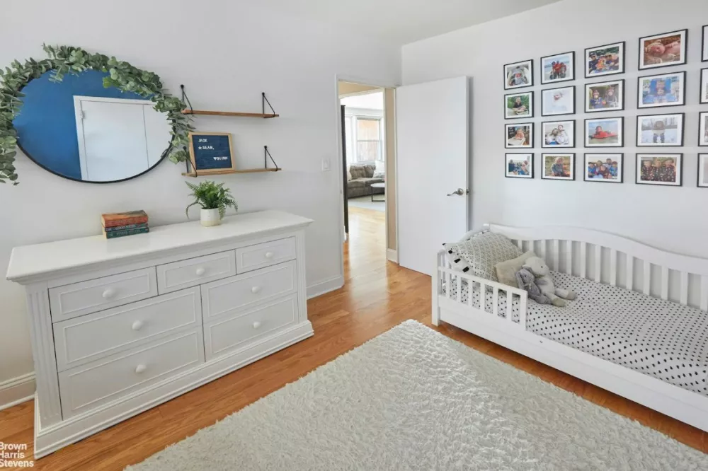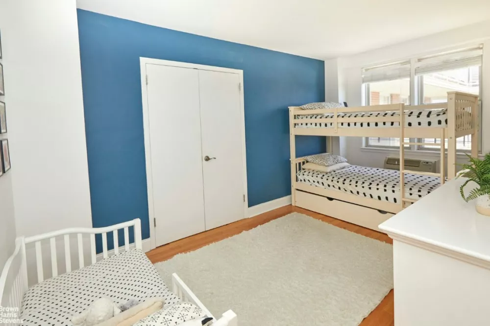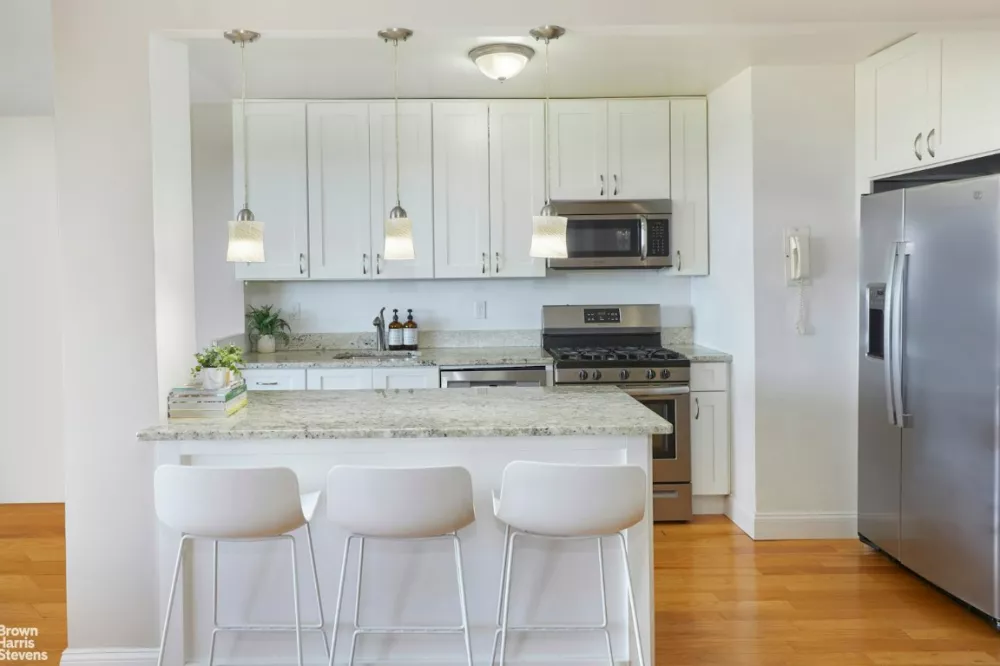 open to the living room. Plenty of storage for all of your cooking essentials, alongside the dining area. Hardwood floors throughout the apartment. Additional bonus play area or office space offers flexibility to accommodate your needs. The spacious and serene primary suite with double exposure has two double-door closets and ample space for a king sized bed and more! The generously sized second bedroom includes a large closet for all of your storage needs. Modern bathroom is tiled with a window. Experience endless views throughout the home, including on your oversized, exclusive terrace facing east, where you can savor breathtaking