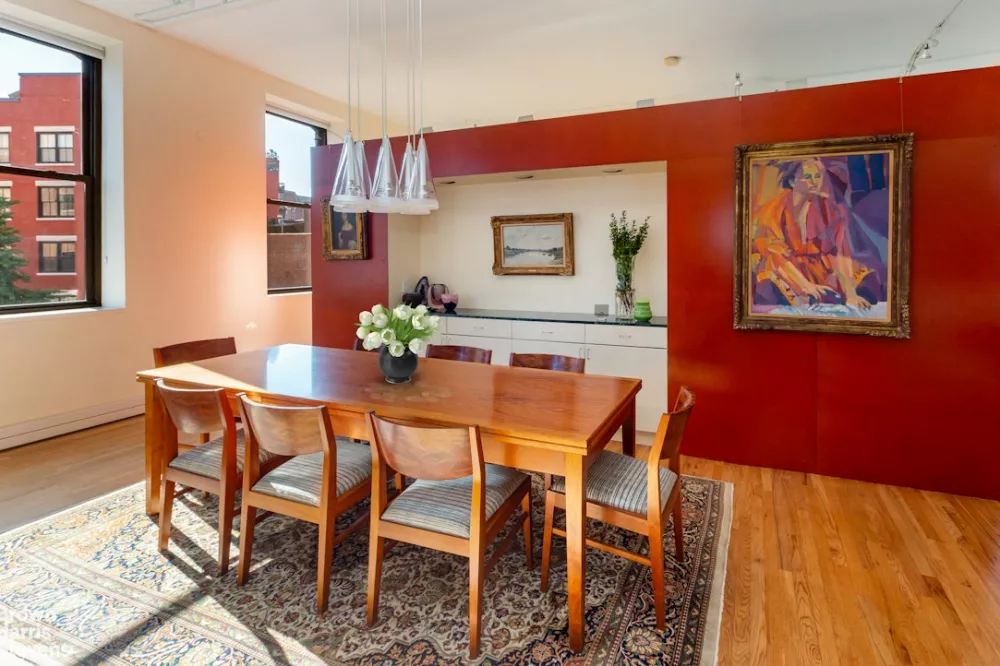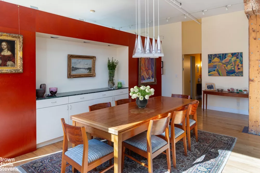 Upon entering the main floor, you'll be welcomed by a sun-drenched living area that seamlessly integrates the dining room, kitchen, and living room into a harmonious and inviting truly massive space and scale- highlighted by soaring 11 ft ceilings, and historic beams and supports from its former life as a horse stable. Southeastern exposures flood the room with morning sunlight, creating a warm, radiant ambiance. On a snowy day, enjoy the cozy comfort of the vibrant wood-burning fireplace, adding both color and warmth to the room. An original wooden beam elegantly separates the living and dining areas, infusing the space with a touch of historic charm creating dramatic historic visual reference to its past.