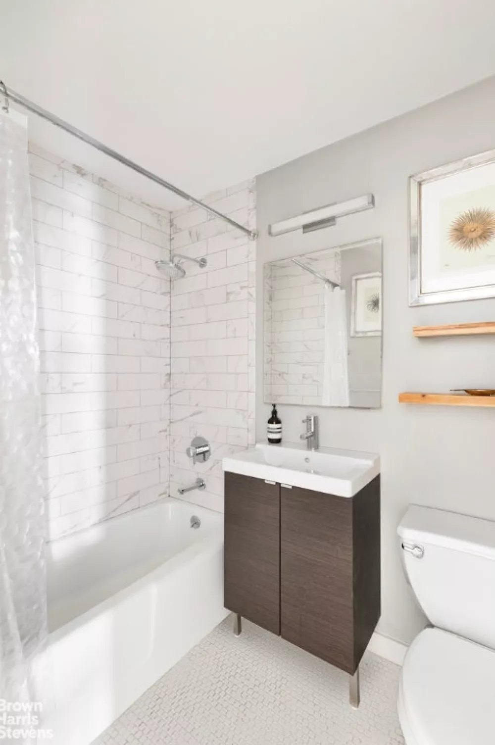 2J at 9 Barrow Street is a renovated loft-like studio that features oak floors throughout, dramatically high ceilings, three oversized windows, and a bright Eastern exposure. The apartment offers three spacious custom closets, and a newly installed through-wall heating and cooling system ensures year-round comfort. The modern kitchen features a breakfast bar, white quartz countertops and stainless-steel appliances (including a built-in microwave and dishwasher). The bathroom is outfitted in marble tile and features fixtures by Grohe, including a tub and waterfall shower head. The vanity and mirrored medicine cabinet provide ample storage space.