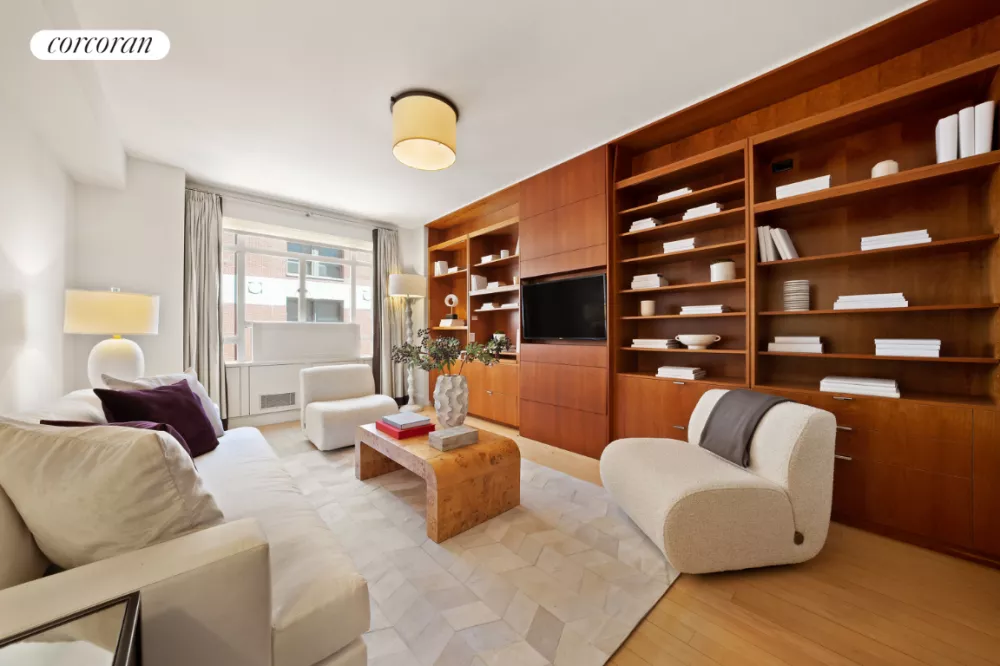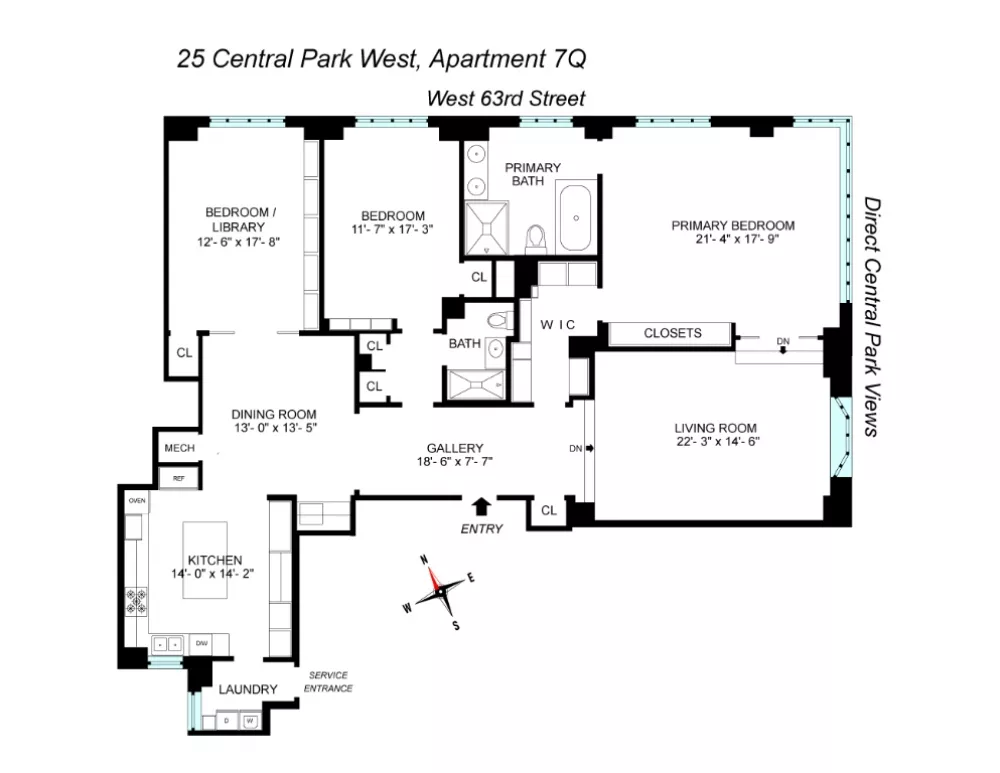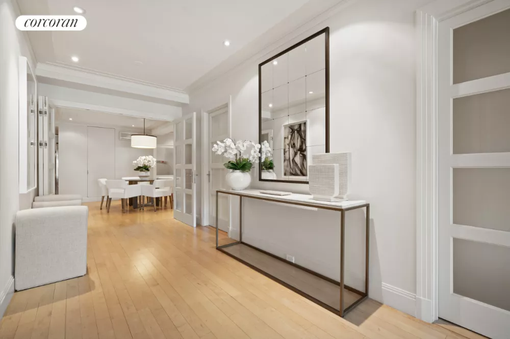 The very gracious 18 X 8 entry foyer is a wonderful centerpiece from which all rooms are approached and includes immediate views of Central Park. The living room includes a marvelously large window span offering eye-catching Central Park views east across the park and to the south along the Central Park South skyline. Opposite the living room, a separate dining room with built-in bar cabinet easily accommodates dining on a large scale. A comfortable library/media room adjacent the dining room (can double as a third bedroom) includes a wall of custom bookcases and offers a cozy contrast to the larger living space. The spacious windowed kitchen is a chef's dream with a center island and abundant storage. The vast corner primary bedroom suite, down a separate hall off the foyer, captivates with open views of Central Park and includes a luxuriously spacious windowed bath with tub and stall shower and separate sitting area. A second bedroom with beautifully outfitted marble tiled en-suite bath with stall shower completes the layout. The apartment includes hardwood floors throughout and features a separate laundry room with access to a major service elevator - a considerable advantage for deliveries, construction, and moving in and out.