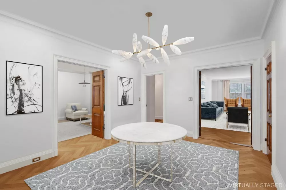 The traditional original details, including high ceilings, herringbone hardwood floors, and a gracious central gallery with a powder room, further enhance the well-thought-out and versatile layout.