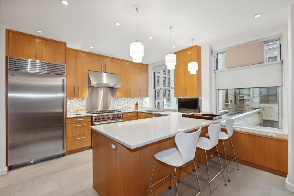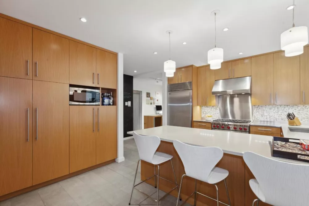 The suburban-sized eat-in chef's kitchen features a breakfast bar, top-of-the-line appliances, oversized windows, washer/dryer, and an adjacent extra area that could conveniently accommodate a dining table or office.