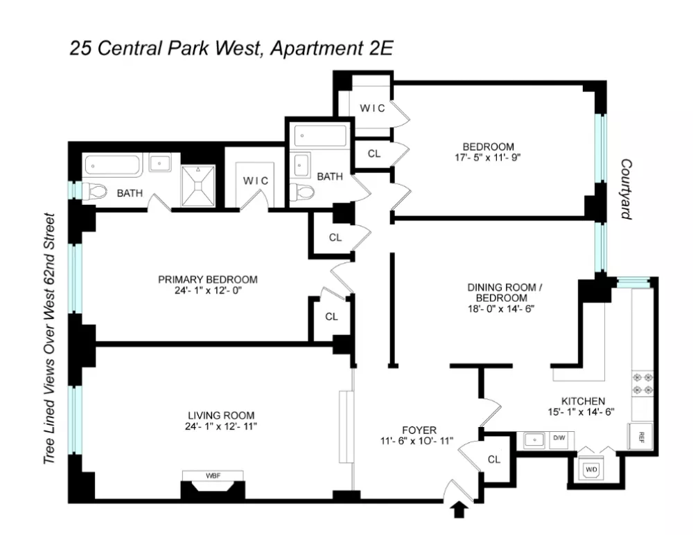 Located on Central Park West at The Century prewar condominium, this generously proportioned south facing "E line" 2 bedroom and 2 bathroom home has all new windows, beautiful hardwood floors throughout and tree-lined outlooks. This inviting and expansive  home offers an exceptionally gracious entry foyer which flows seamlessly to the living spaces and includes a separate library/media room/dining room which can easily double as a 3rd bedroom with a bath off the hall.