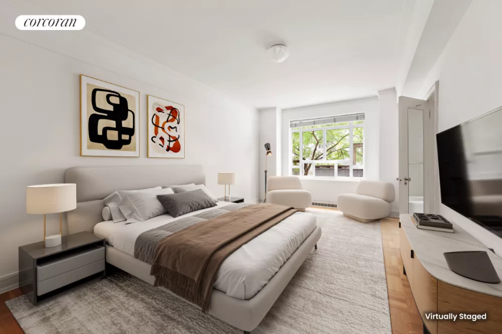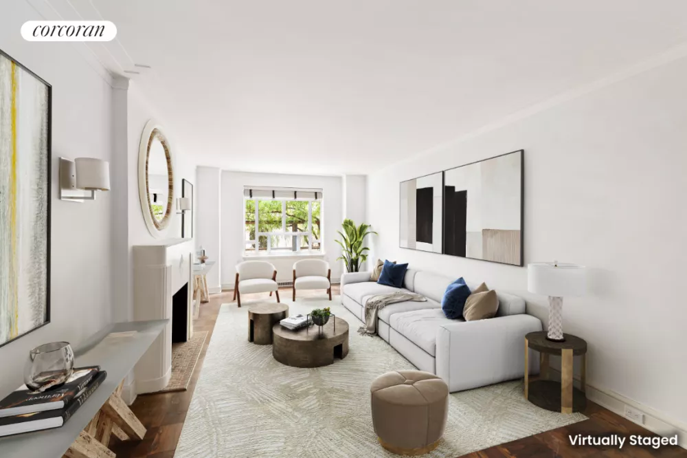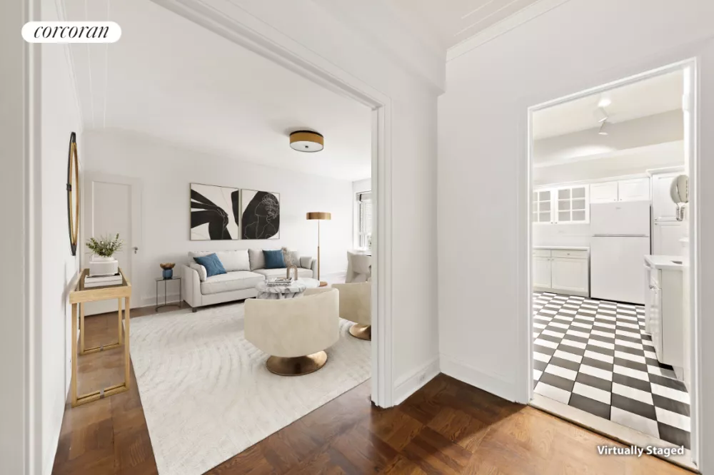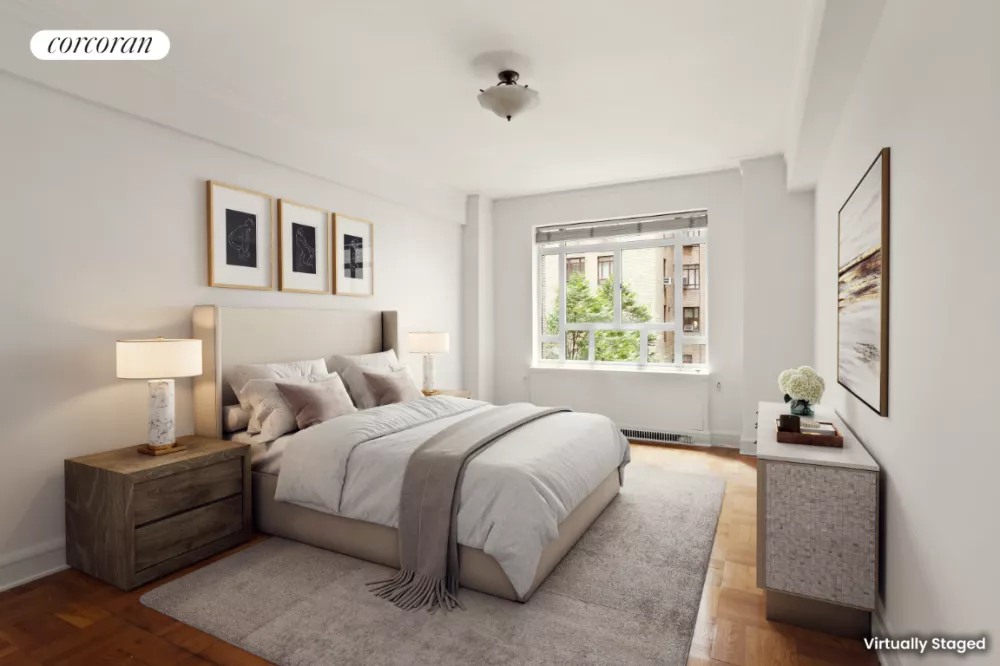 The very gracious 12 X 11 entry foyer is a wonderful centerpiece from which all rooms are approached. The living room includes a handsome original decorative deco fireplace mantel and views of trees. Opposite the living room, a separate second living room works well as a library, dining room or 3rd bedroom. The very spacious windowed kitchen includes abundant storage and a laundry closet. Down a separate bedroom hall, the vast primary bedroom suite includes tree-lined views and includes a spacious windowed bath with tub and stall shower. A second equally spacious bedroom with a bath (which doubles as a powder room for guests) just outside in the hall completes the layout. The apartment includes meticulous hardwood floors throughout and access to a separate service elevator - a considerable advantage for deliveries, construction, and moving in and out.