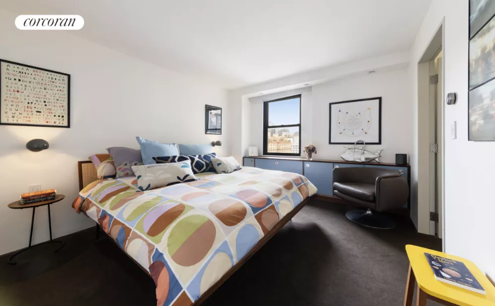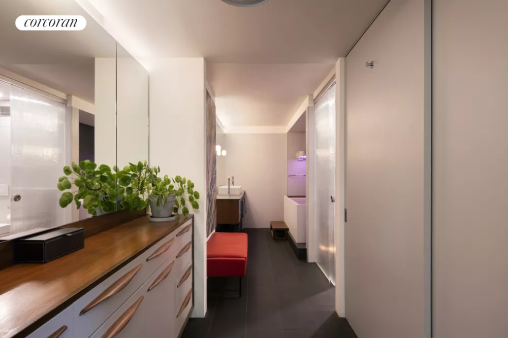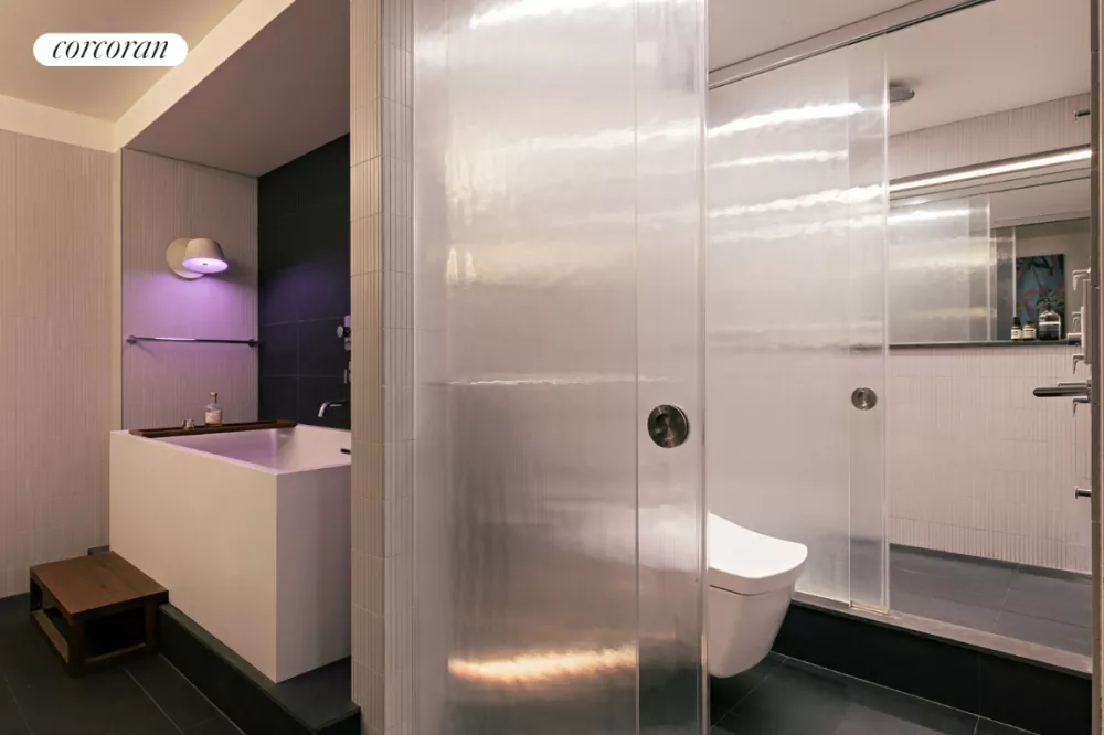 The serene owner's suite boasts a king-size bedroom, built-in storage and double pocket doors that reveal a large dressing room flanked by a 40-inch-wide custom dresser and double-height closet. Ahead, the breathtaking spa bathroom impresses with Chromtec tiles, a wide basalt vanity topped by Duravit sinks and a freestanding Bain-Ultra ThermoMasseur air jet tub for two featuring a heated backrest and a custom-made walnut step. Chic floor-to-ceiling frosted glass doors open to a water closet with a Toto Neorest commode and a separate walk-in shower featuring an anti-fog mirror, external exhaust, and five Hansgrohe shower heads and sprayers. Off the living room, a separate bedroom wing includes a well-appointed guest bathroom. Two bedrooms here -one overlooking the east terrace and another featuring a custom television mount - provide plenty of space for a den/home office, TV room, guest space or whatever your needs require. Extensive smart home controls, including Lutron lighting and blinds and Nest thermostats, add comfort and ease to this exceptional Gramercy Park home.