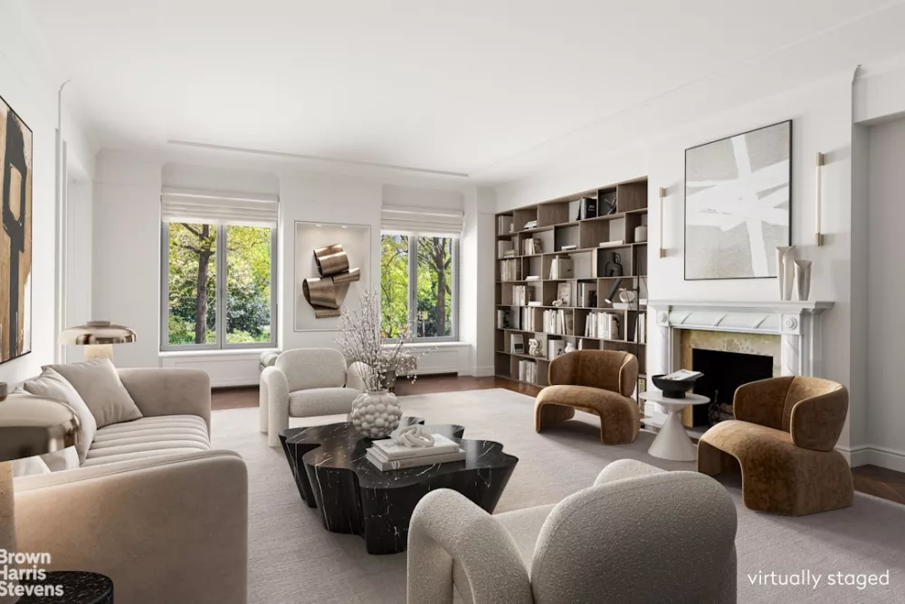 The grand entrance gallery with classic oak herringbone floors and inlaid with mosaic leads into the enormous living room on the Park. Sunlight streams in through tall windows while the trees of Central Park are ever-present in the beautifully framed views. The side by side formal dining room with 2 entrances also faces the Park and is perfect for hosting large gatherings and intimate dinners.