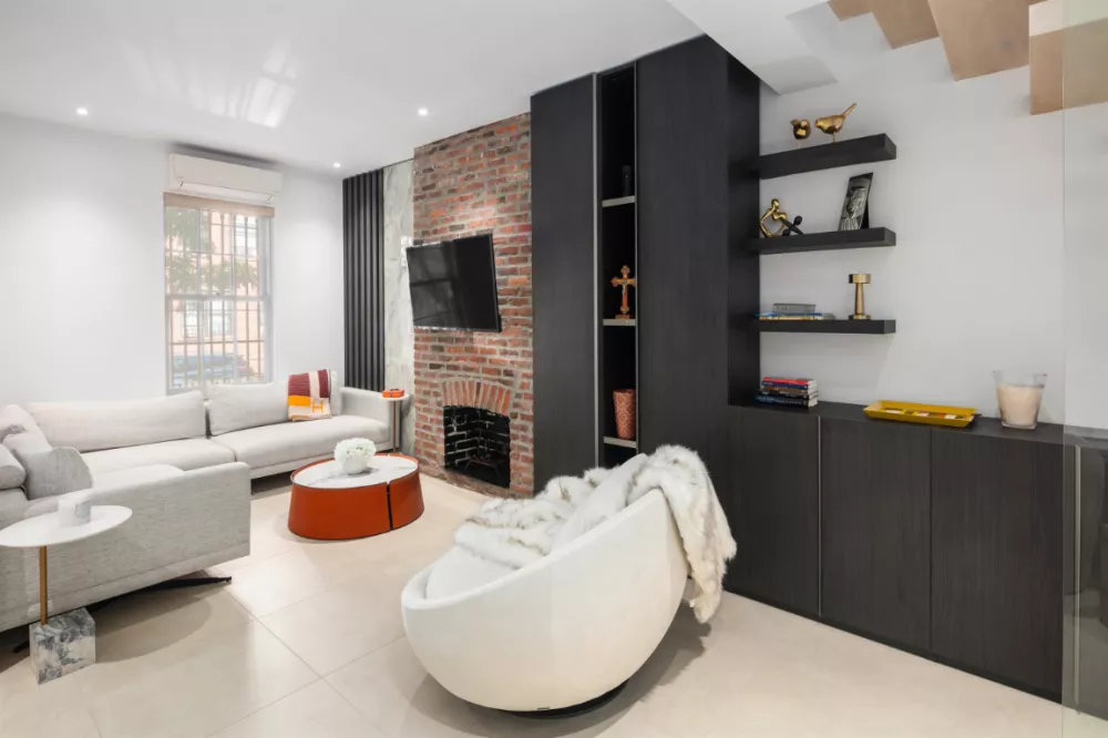 Other features include exposed brick walls, washer and dryer, double height ceilings and motorized shades.