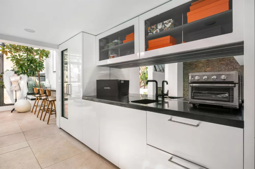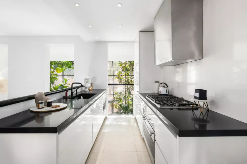 The gourmet kitchen comes fully equipped with top-of-the-line appliances and a view of the garden.