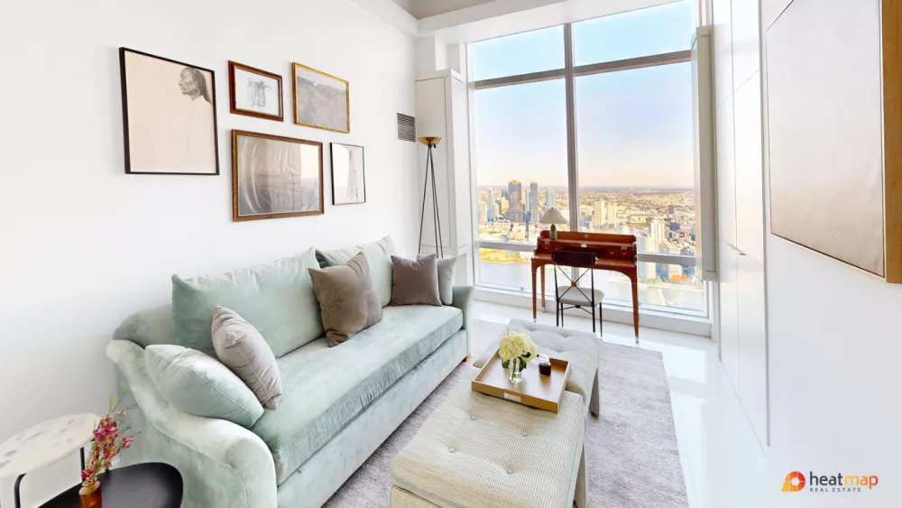 Upon entry, you're greeted by 12-foot ceilings and floor-to-ceiling windows that offer sweeping vistas from the George Washington Bridge to Long Island City, and even the planes at LaGuardia. The expansive great room, excellent for entertaining, flows seamlessly into a windowed eat-in kitchen with custom cabinetry and top-tier appliances.