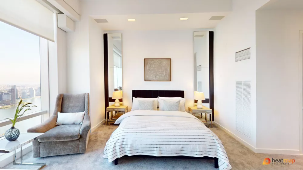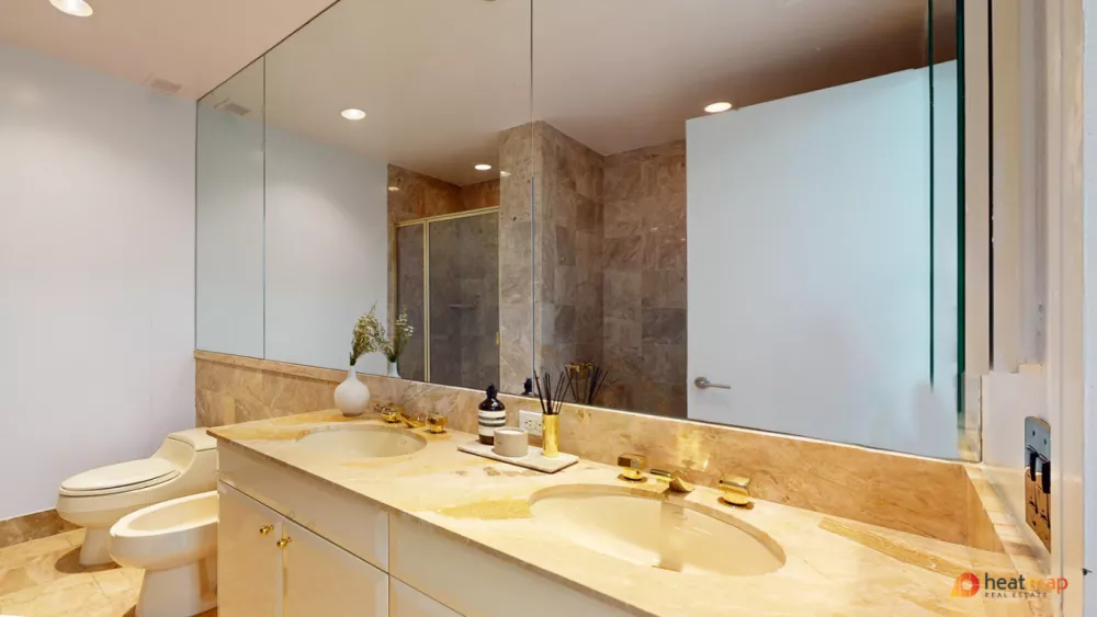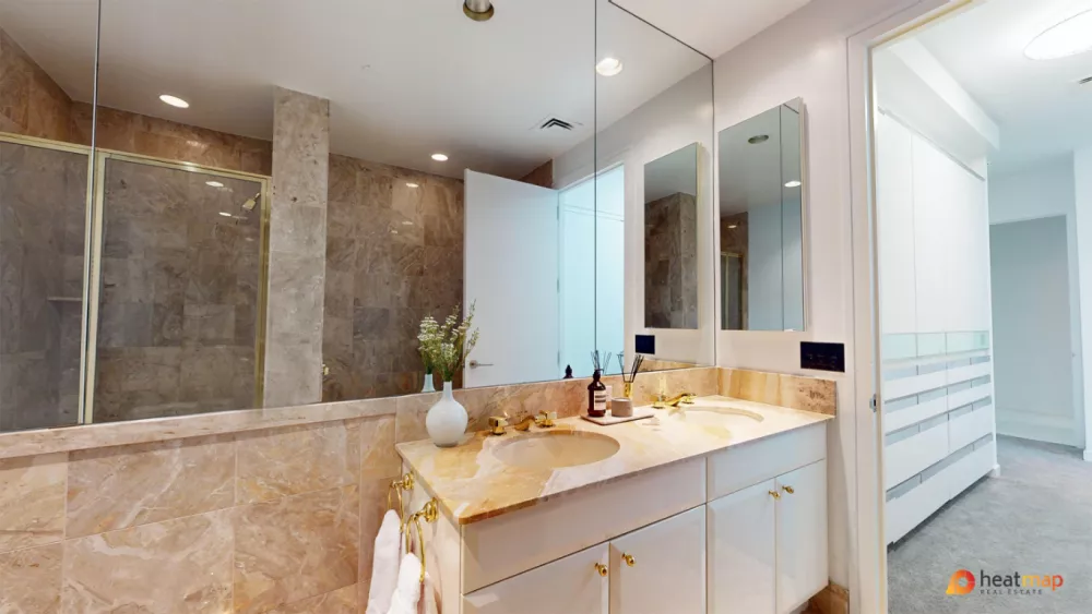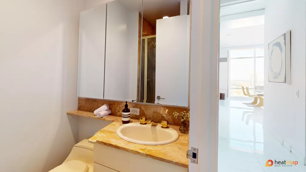 All three bedrooms are generously proportioned and thoughtfully positioned away from the living areas to ensure privacy. Each bedroom faces east, offering breathtaking river views and spectacular sunrises. Ample custom closets provide luxurious storage throughout. The primary suite is a true retreat, with a spacious dressing area and an en-suite marble bathroom designed for relaxation.