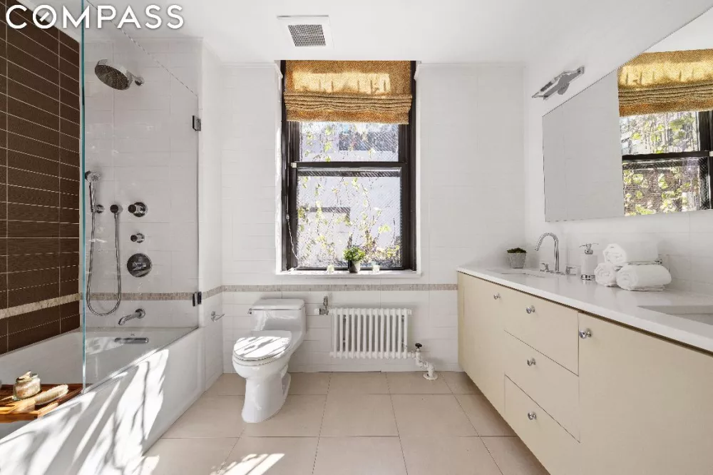 The main level also features an office space and a luxurious guest bath with an exposed rain shower. The large adjacent second bedroom includes a private windowed ensuite bath and walk-in closet, with southern and eastern exposures. Across the hall, you'll find a spacious additional guest bedroom that could also serve as a library or den.