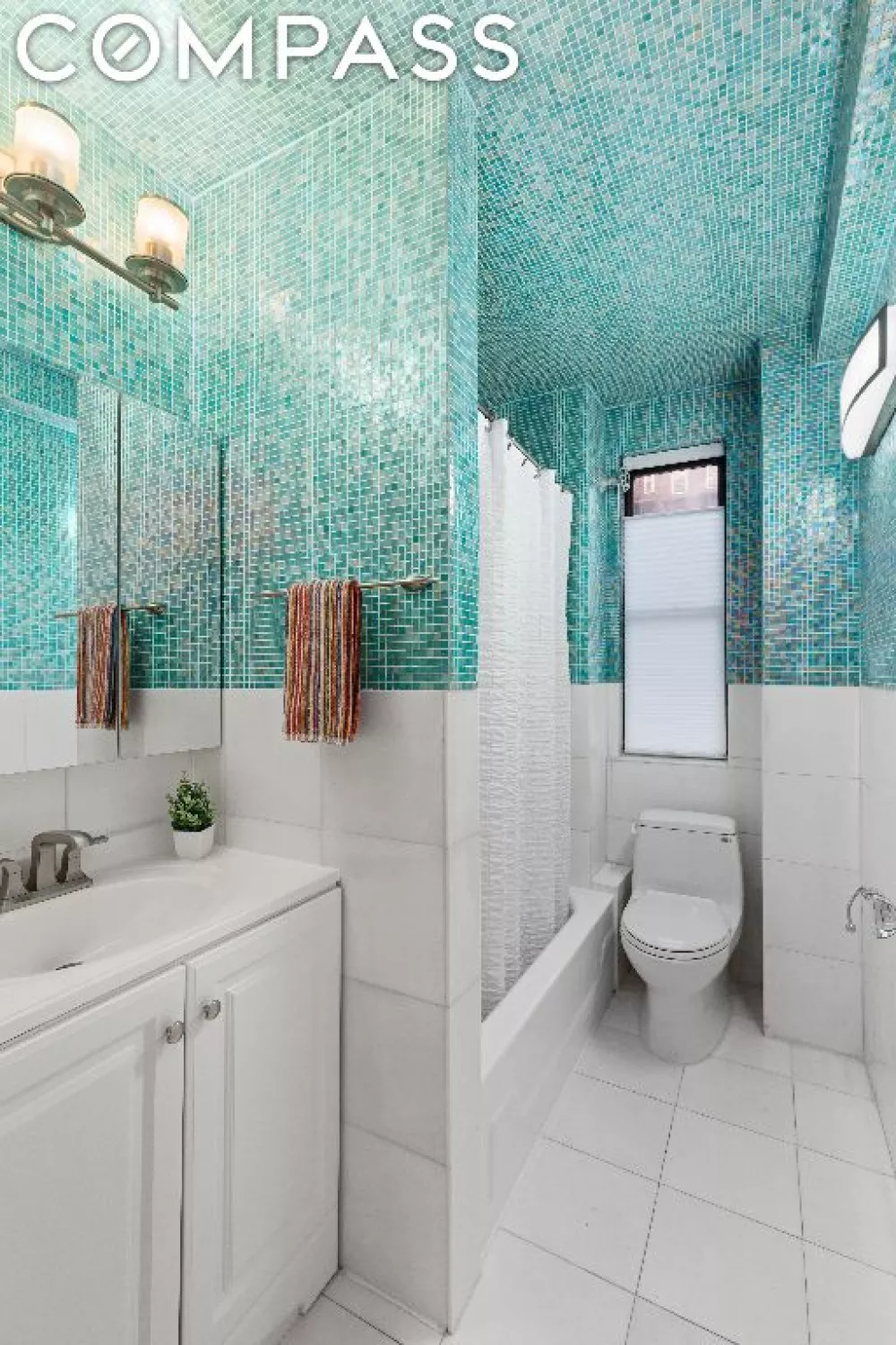 The bedroom is large enough to fit a king size bed, 2 night tables and additional furniture. The built-ins include drawers and a desk. A walk-in closet and three additional large closets provide ample storage. The windowed, tiled bathroom features a newly glazed tub, new vanity, medicine cabinet and light fixtures; as well as an adjacent linen closet.