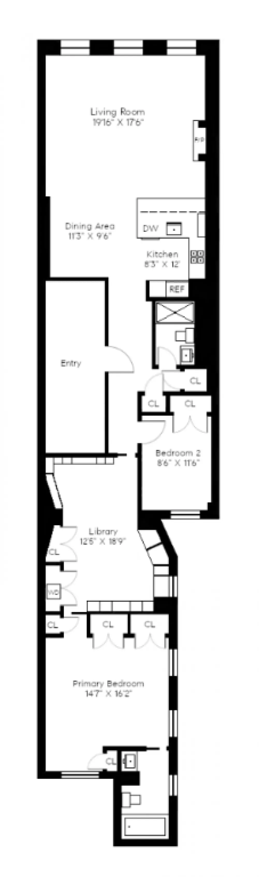 Towards the southern end of the home, the gracious primary bedroom includes a delightful en-suite windowed bath, generous closet space, and excellent natural light and garden views from southern and eastern exposures. The 2nd bedroom also benefits from southern views and sunlight with a chic, newly updated full bath nearby. A marvelous paneled library boasts floor-to-ceiling built-in shelving and storage, a desk, and a pocket door on each side for privacy. The library can easily double as a home office or bedroom!