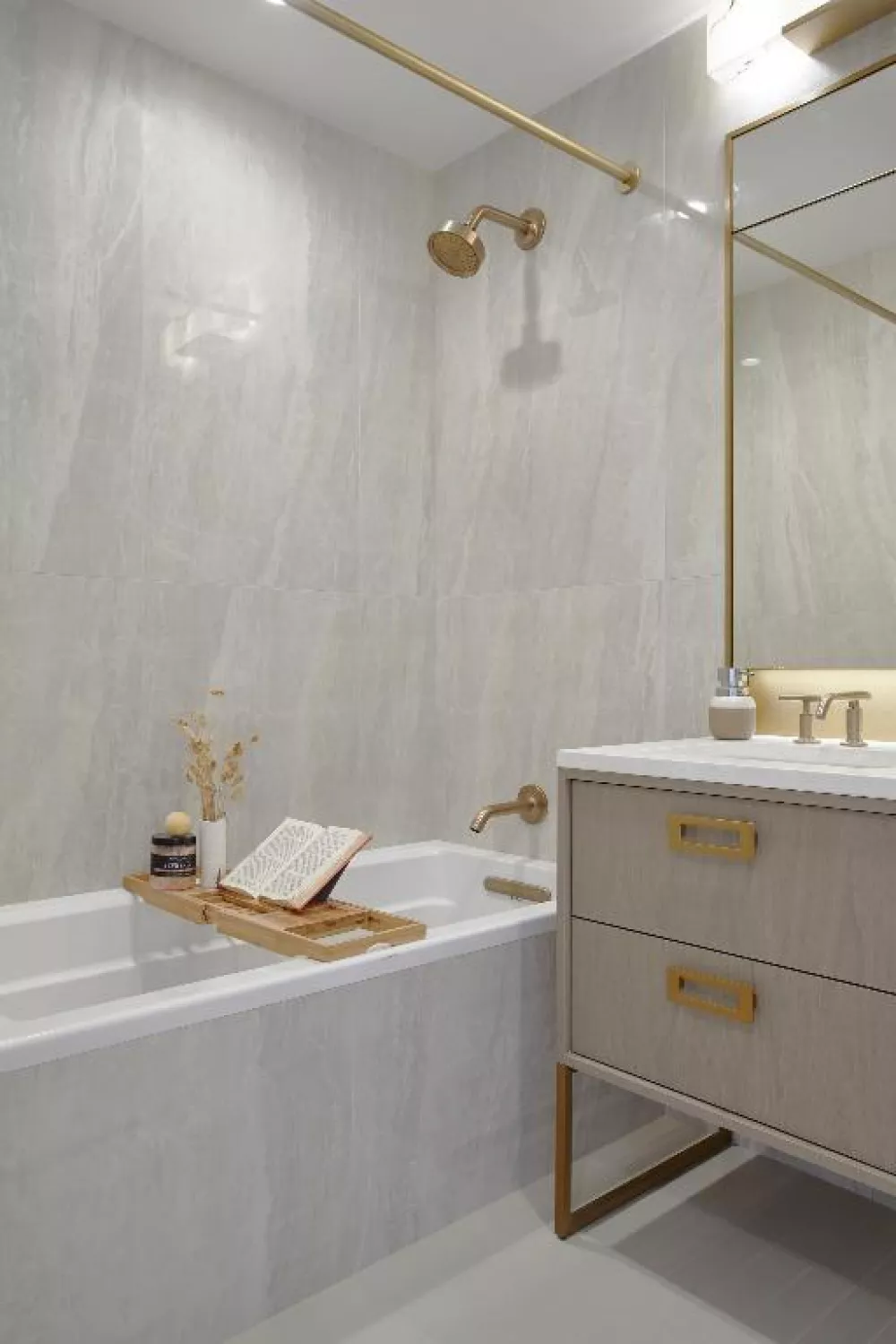 The secondary bathroom is equally luxurious. High-end finishes include grey ash veneer and an iceberg white marble vanity, complemented by a decorative wall sconce. It is equipped with elegant light bronze Kohler Purist fixtures and accessories throughout, a custom recessed medicine cabinet with bronze frame and alcove, luxurious Kohler Underscore tub, Kohler Verticyl undermount sink and Toto Eco Supreme one-piece toilet.