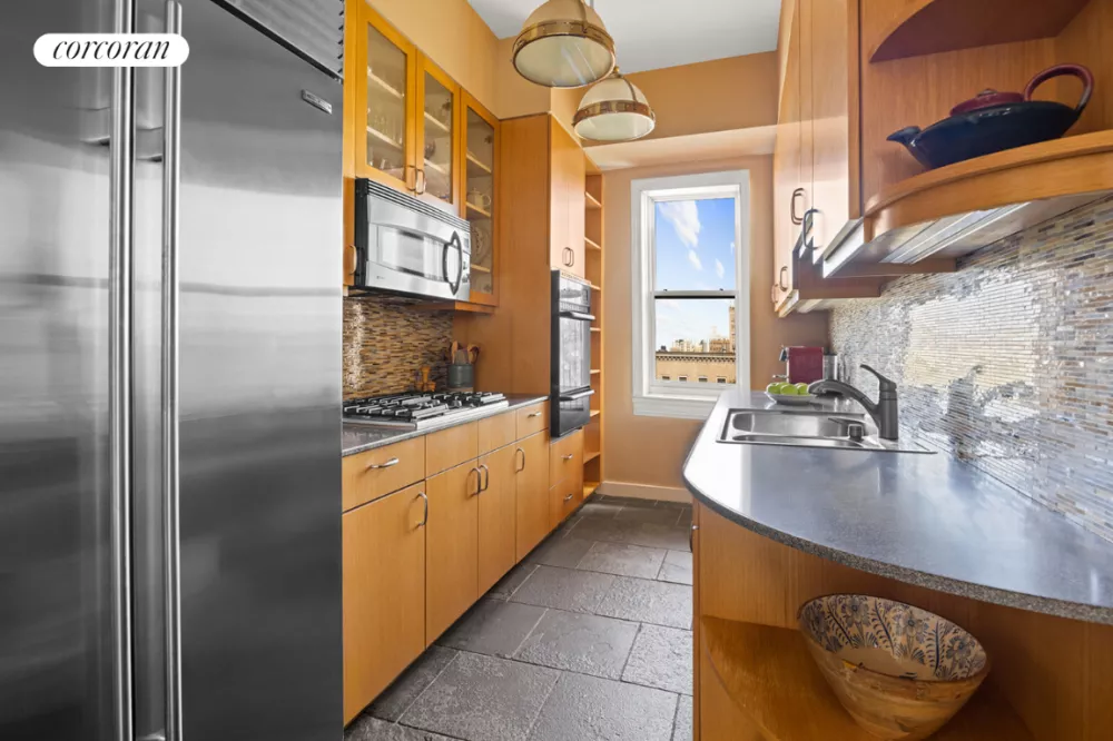 A spacious entry foyer greets you upon arrival and leads to the living and sleeping quarters that are privately separated on either side. Relax and host guests in the large living room, which connects via glass-paneled French doors to the formal dining room overlooking the park. Adjacent is a well-equipped windowed kitchen with tiled flooring, stunning wood cabinetry, a floor-to-ceiling pantry, decorative tile backsplashes, and premium stainless steel appliances. Here you'll also find a convenient concealed washer-dryer.